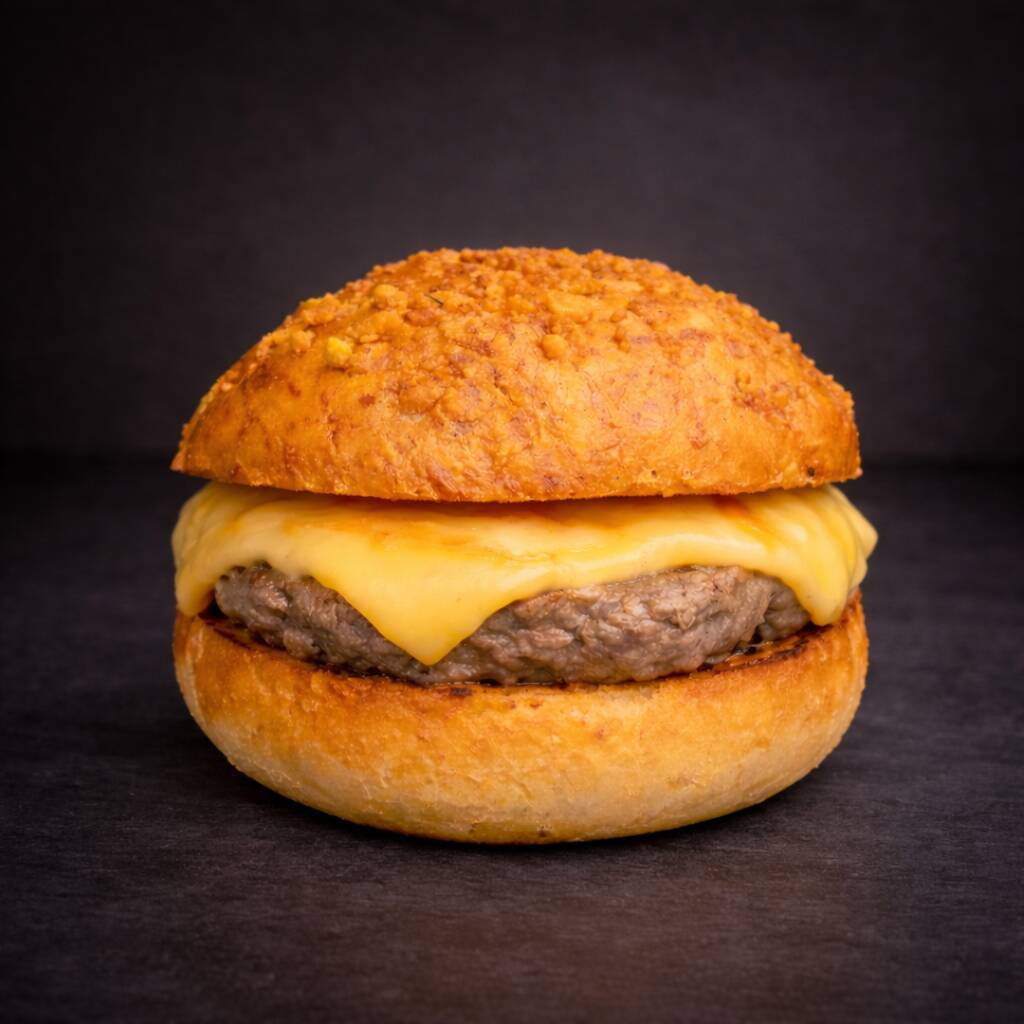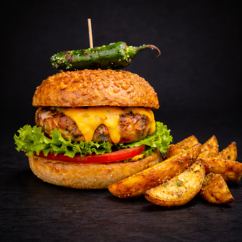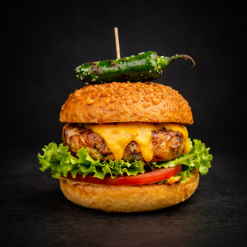 Hamburguesa de 200 gr (en crudo) de carne de res rellena de queso mozzarella, costra de queso, dip de queso amarillo, tocino y jalapeño, lechuga y jitomate, acompañadas de chips camote y papa sazonadas con pimienta limón.