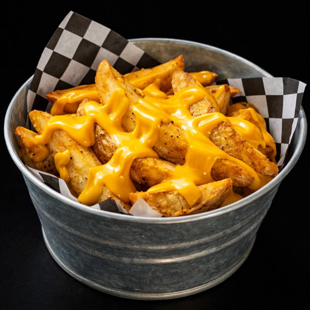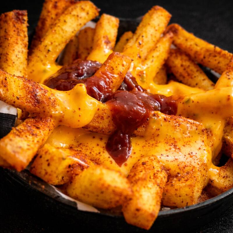 papas corte frances sazonadas con paprica acompañadas de un dip de queso amarillo y chipotle