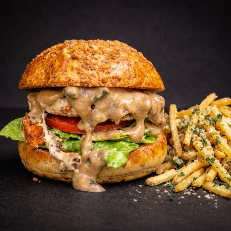 Hamburguesa de 130 gr de carne de res, costra de queso y salsa de hongos, lechuga y jitomate, acompañadas de chips camote y papa sazonada con pimienta limón.