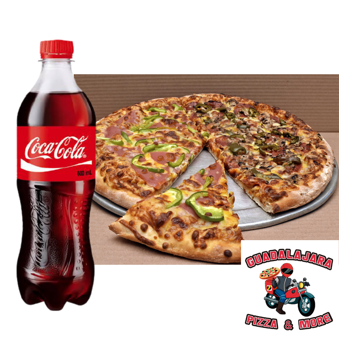 Incluye una pizza de dos ingredientes de treinta y dos rebanadas y refresco de 1.5Lts