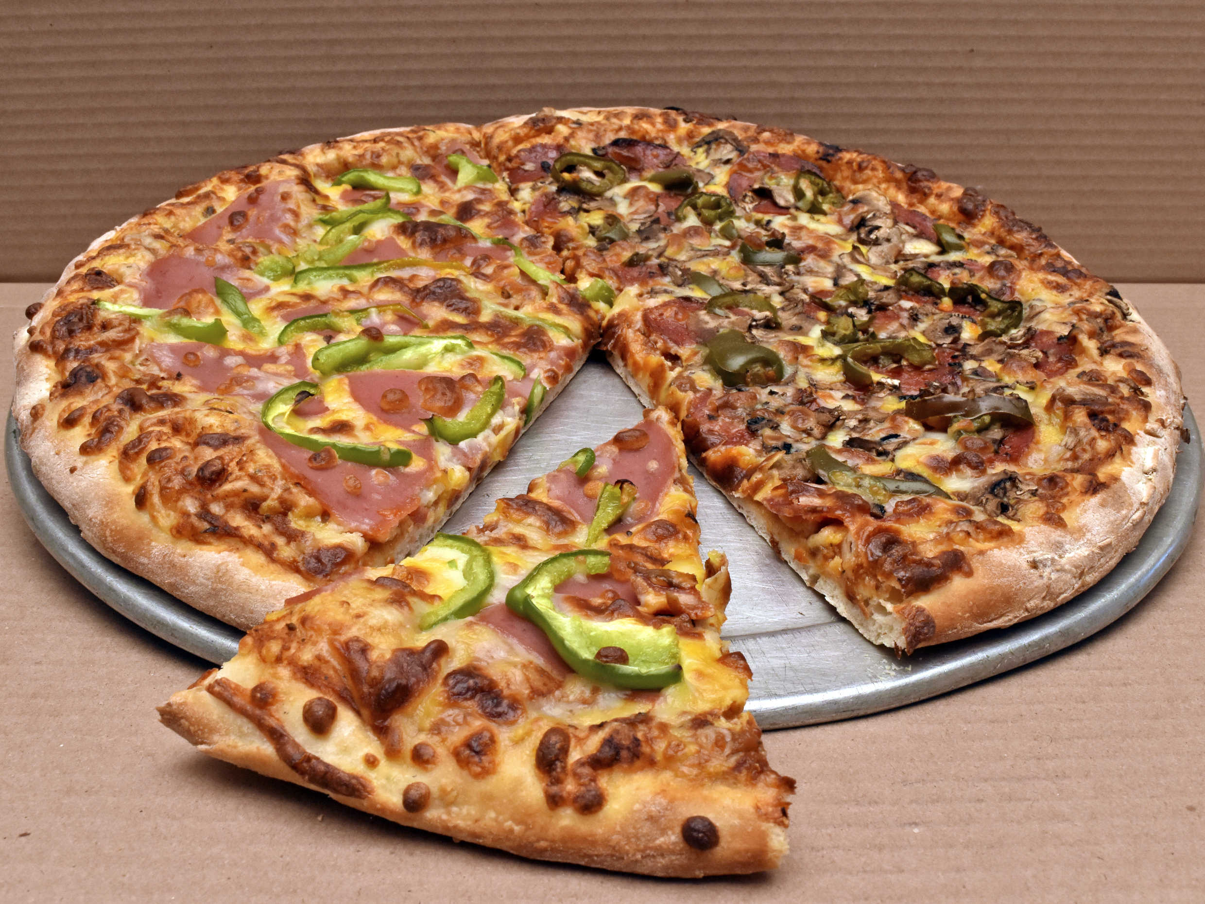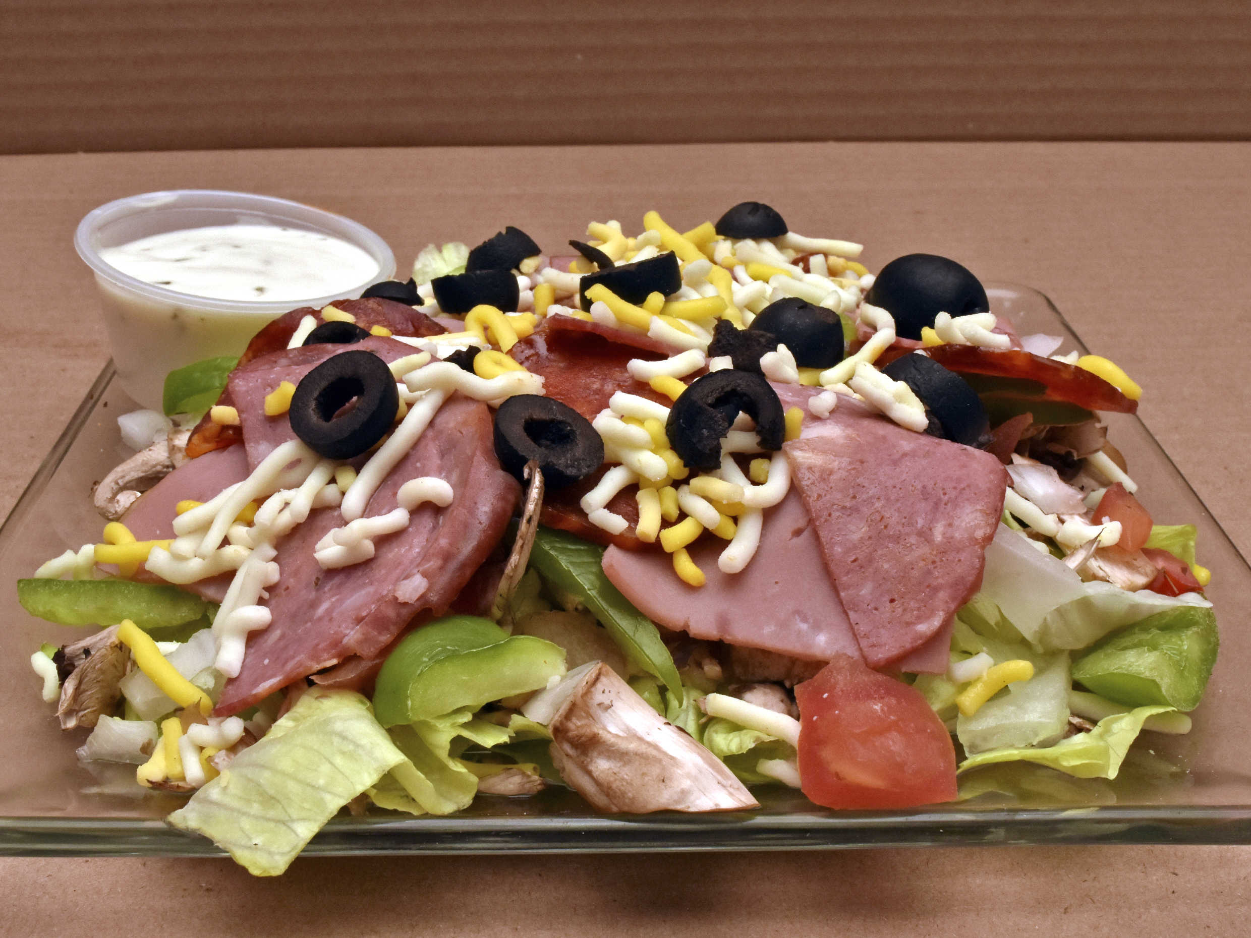 Lechuga, jitomate, cebolla, chile morron, champiñones, peperonni, salami, jamón, queso y olivos negros