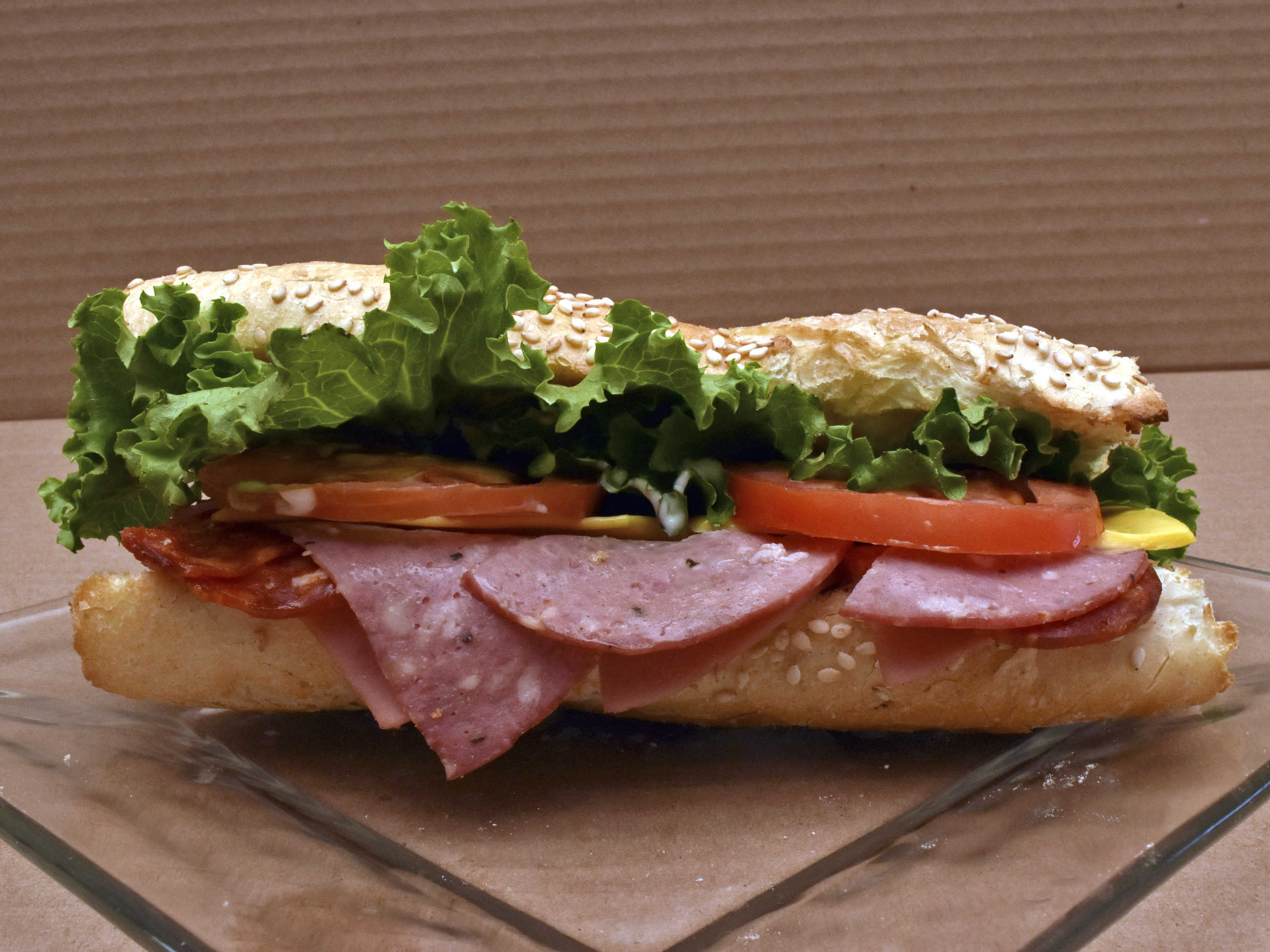Peperonni,salami, jamón,queso amarillo,mayonesa,mostaza,lechuga italiana y jitomate