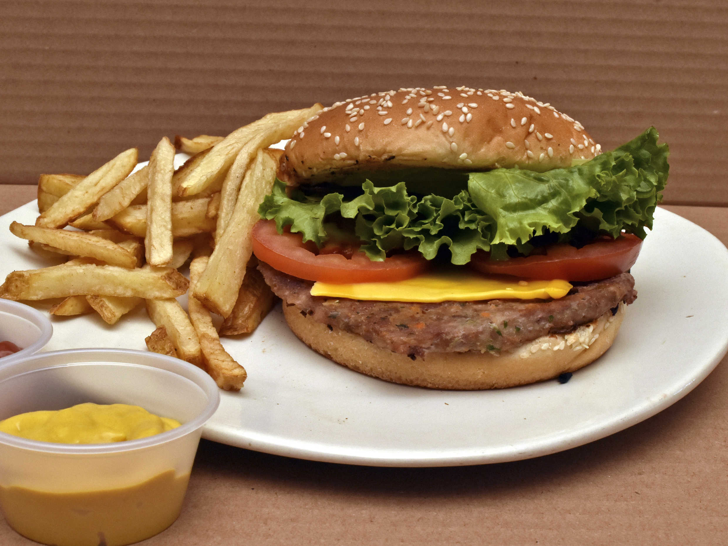 Hamburguesa de res, mayonesa queso amarillo, lechuga, jitomate y cebolla.