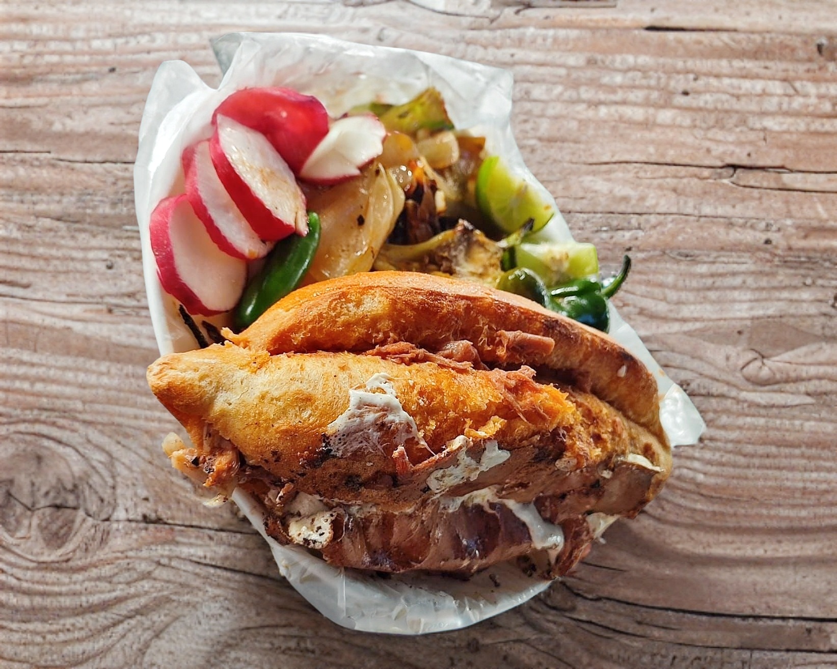 Este lonche es una joyita pa’l antojo. Lleva barbacoa bien suavecita, de esa que se deshace solita, con todo el sabor que te hace decir “uff” desde la primera mordida. Va sellado con queso, cebolla picada pa’ darle frescura, y claro, las salsas: una roja que pica sabroso y una verde cremosa que levanta todo. Todo eso va en un pan doradito por fuera y suave por dentro.