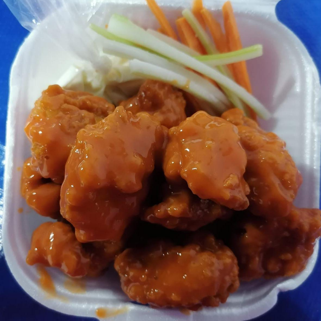 300 gr de boneless de pollo bañados con 1 o 2 salsas a tu elección, acompañados de dip aderezo rach, apio y zanahoria.