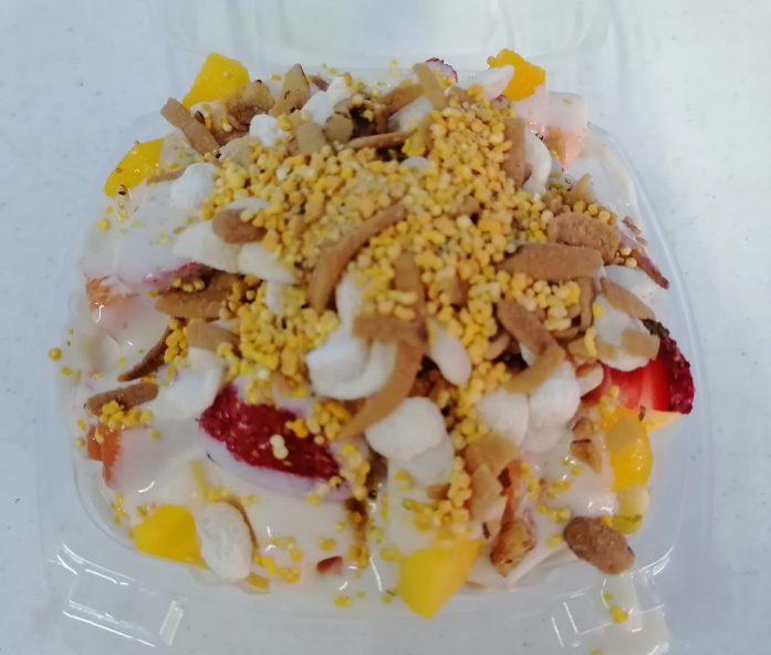 Biónico plato grande acompañado de fruta fresca, crema de biónico y cereal.