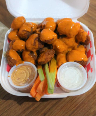 200 gr de palomitas de pollo bañadas con 1 o 2 salsas a tu elección, acompañado de dip aderezo ranch, apio y zanahoria.
