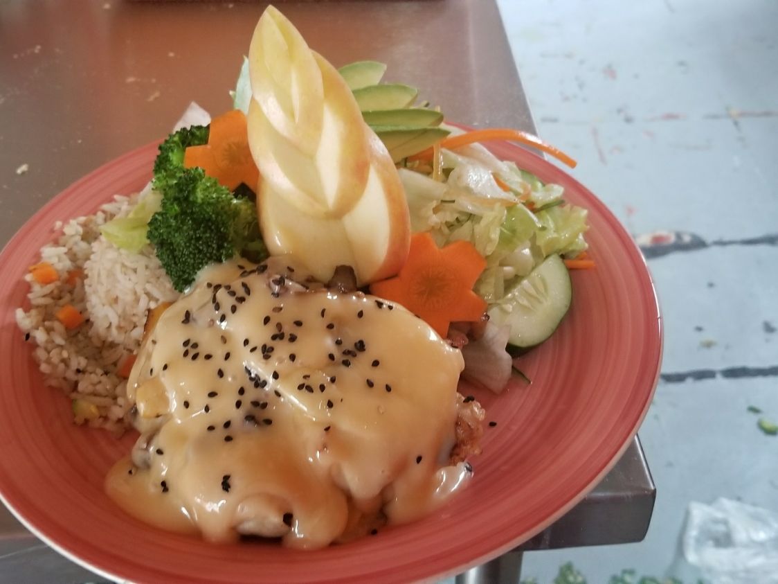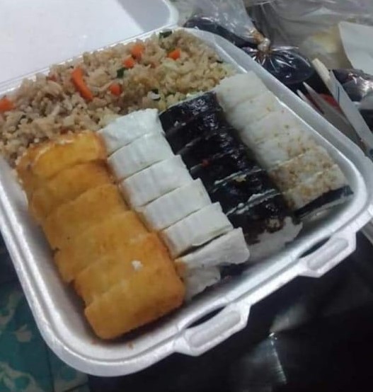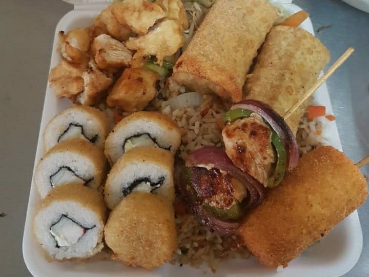 Tepanyaki, arroz frito, 4 bocadillos de sushi empanizado, brocheta de plátano , brochetas de pollo y 2 rollitos primavera