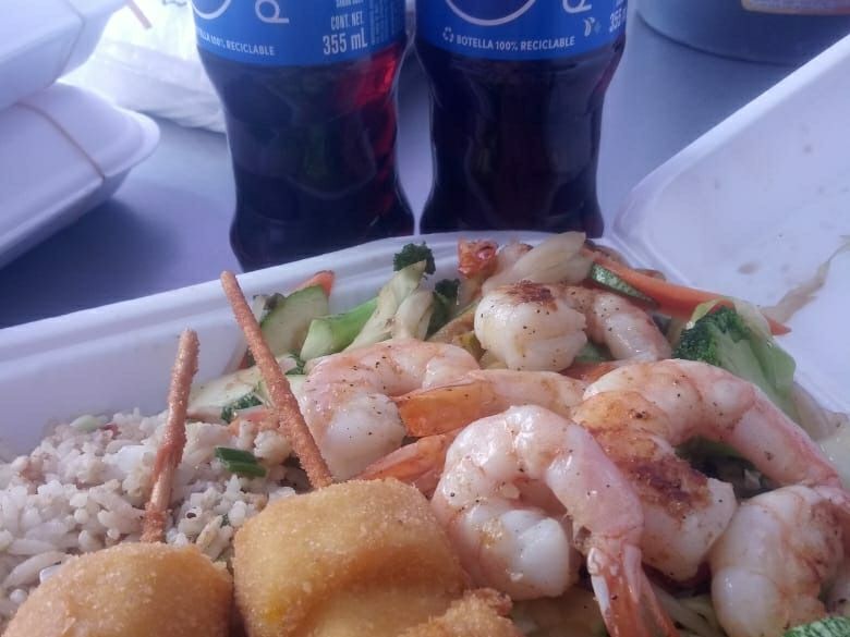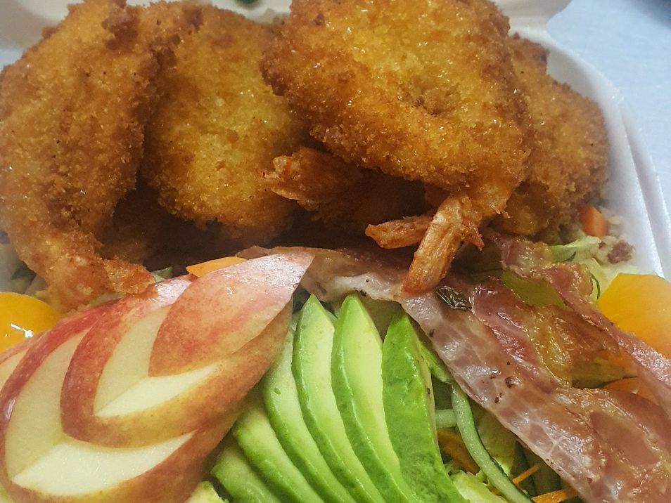 Camarones empanizado acompañado con arroz frito y ensalada de