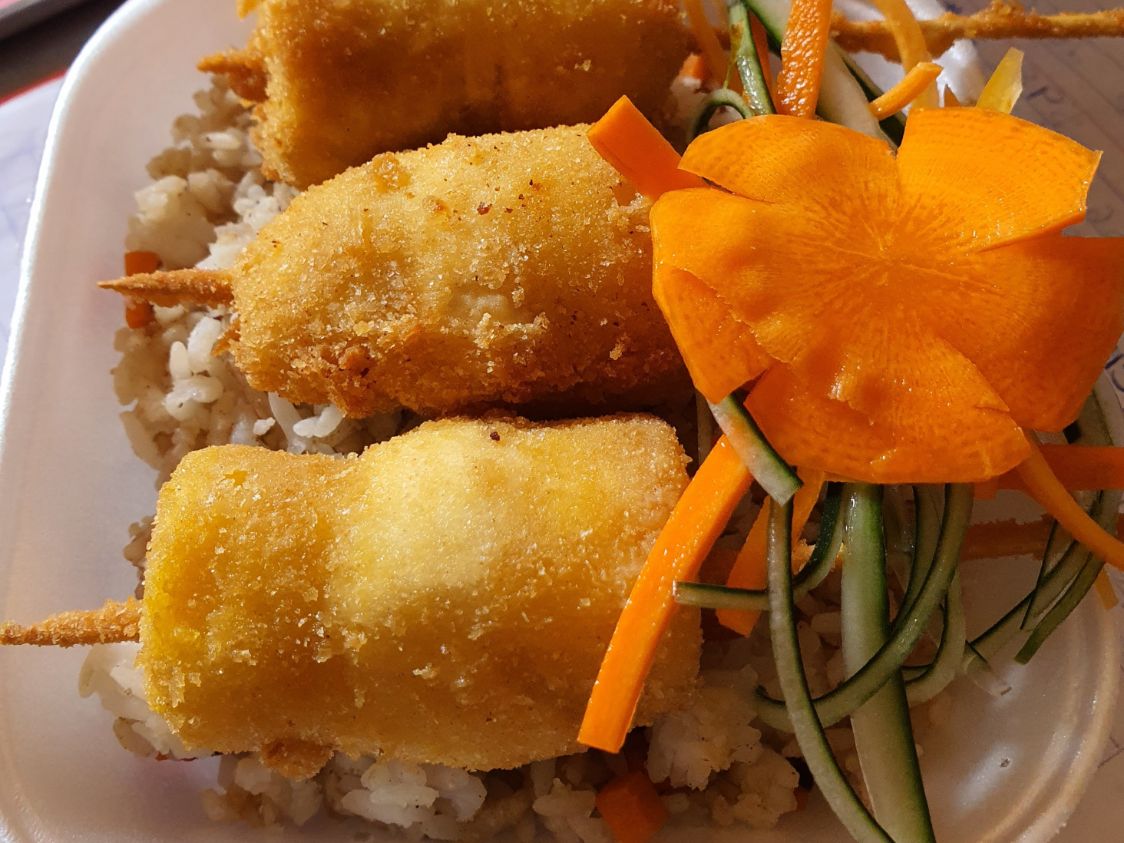 Brochetas de queso manchego envuelto en Camarón y tocino empanizadas acompañado con arroz frito y ensalada de lechuga