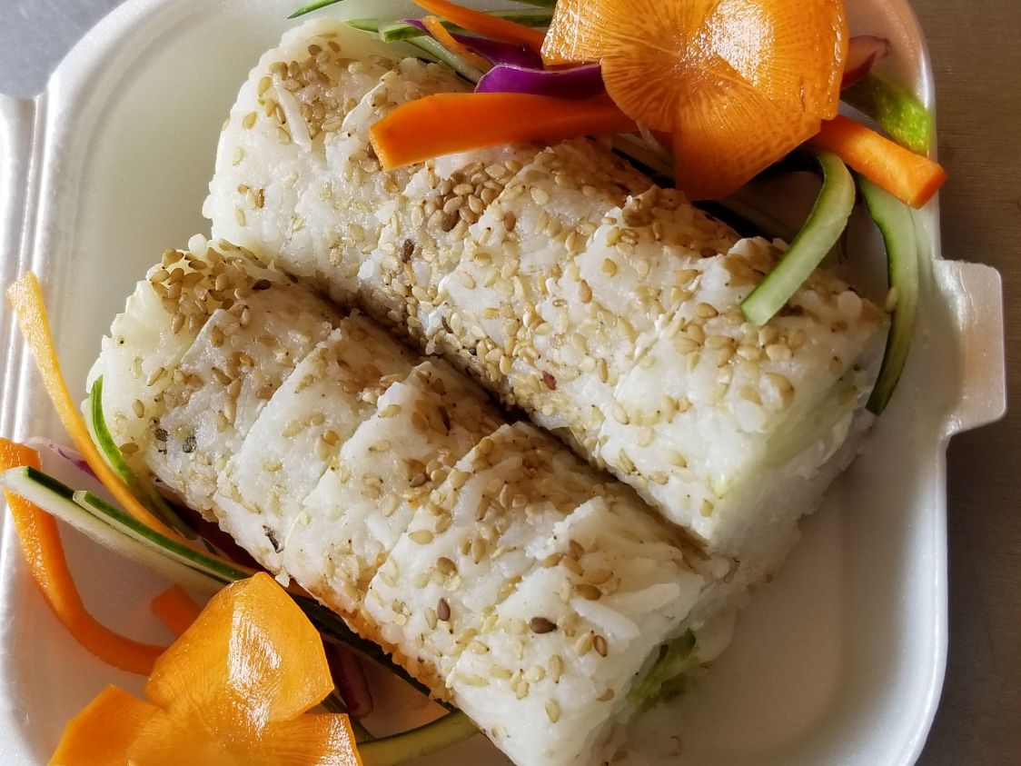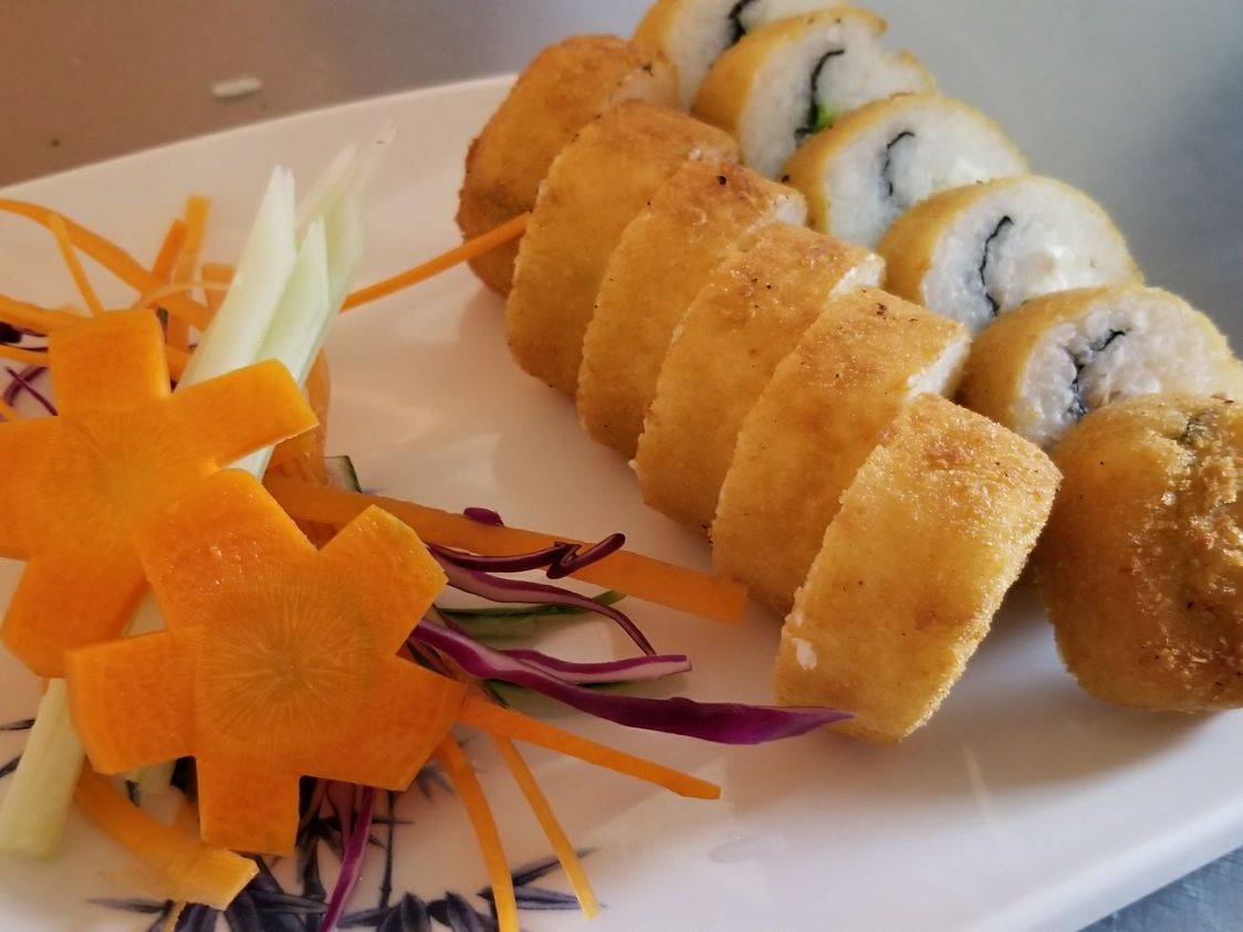 sushi empanizado relleno de philadelphia, surimi y pepino acompañado de una cucharada de arroz frito