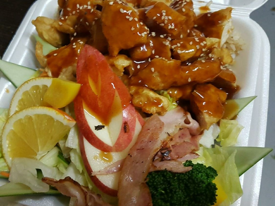 Trocitos de pollo capeado bañados en salsa teriyaki acompañada de arroz frito y ensalada de lechuga