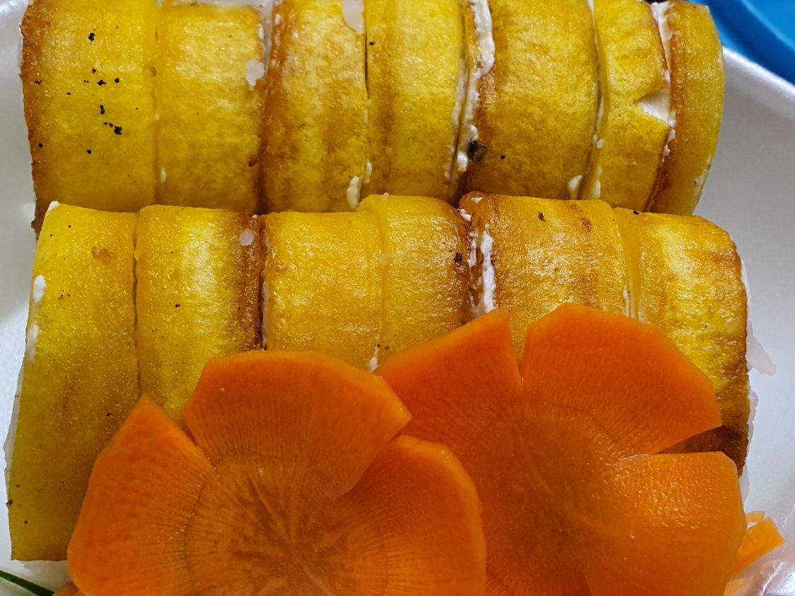 Envuelto de plátano frito relleno de pepino, philadelphia y aguacate