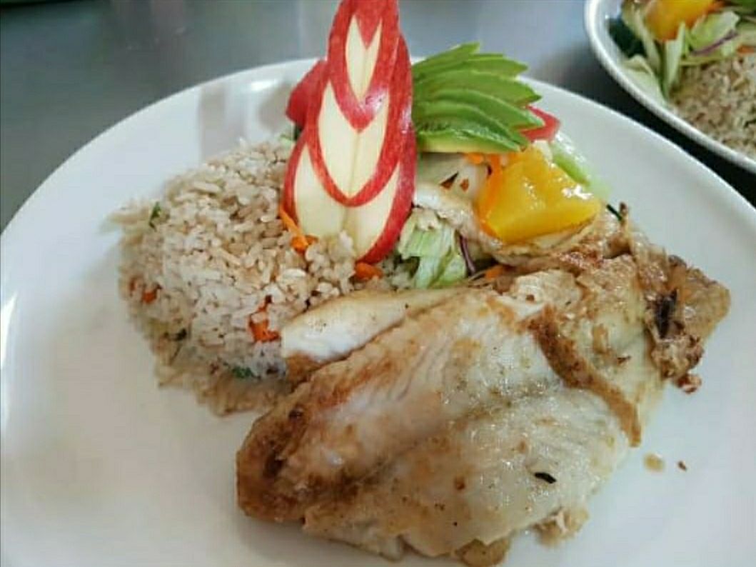 Filete de pescado a la plancha o empanizado acompañado con arroz frito y ensalada de lechuga