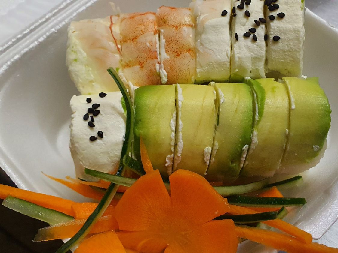 Envuelto de camaron philadelphia y aguacate relleno de pepino, philadelphia y aguacate