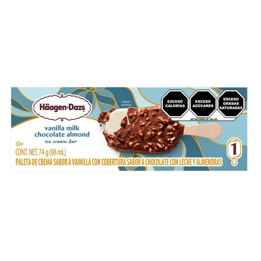 Paleta de vainilla cremosa con cubierta de chocolate y crujientes almendras.