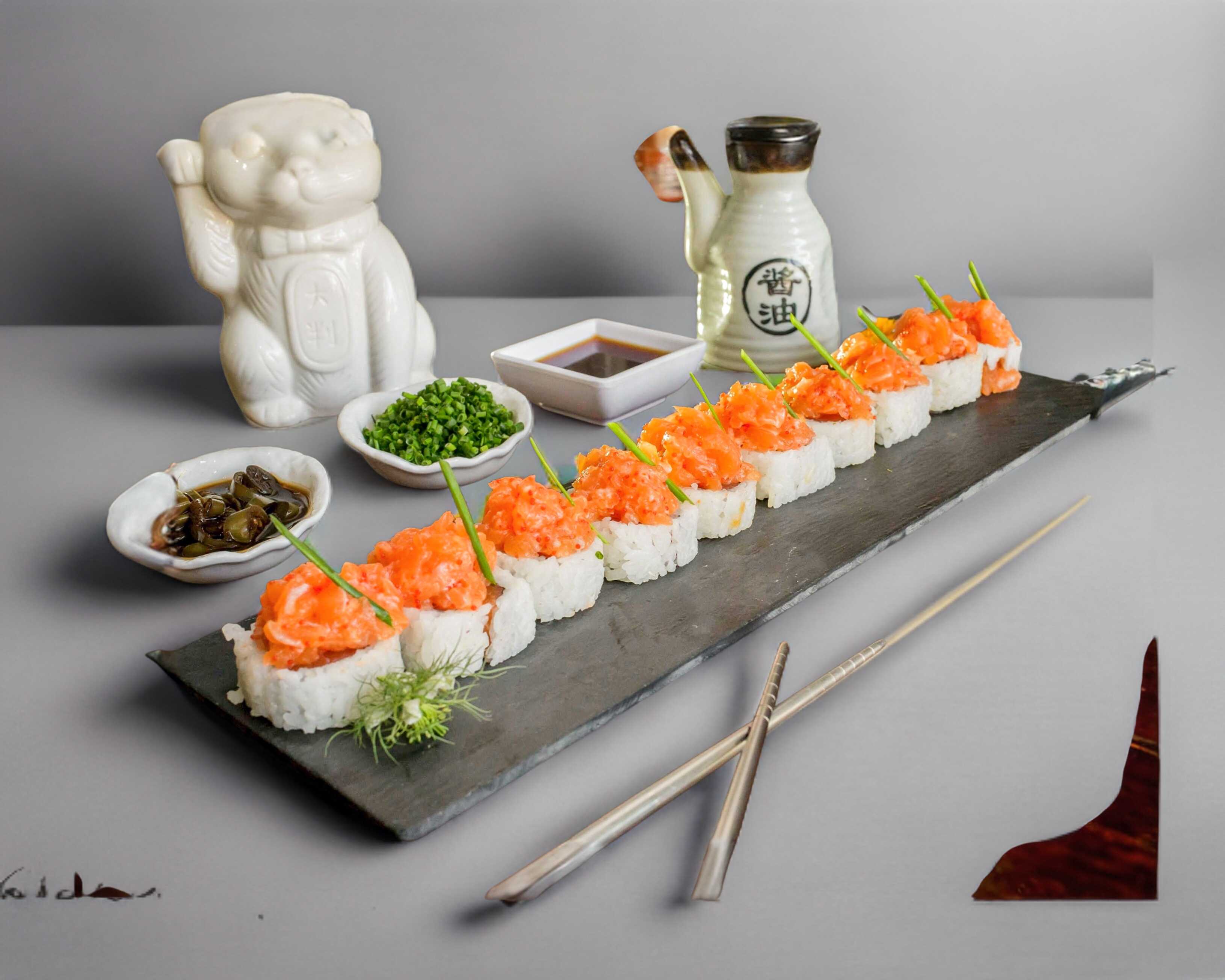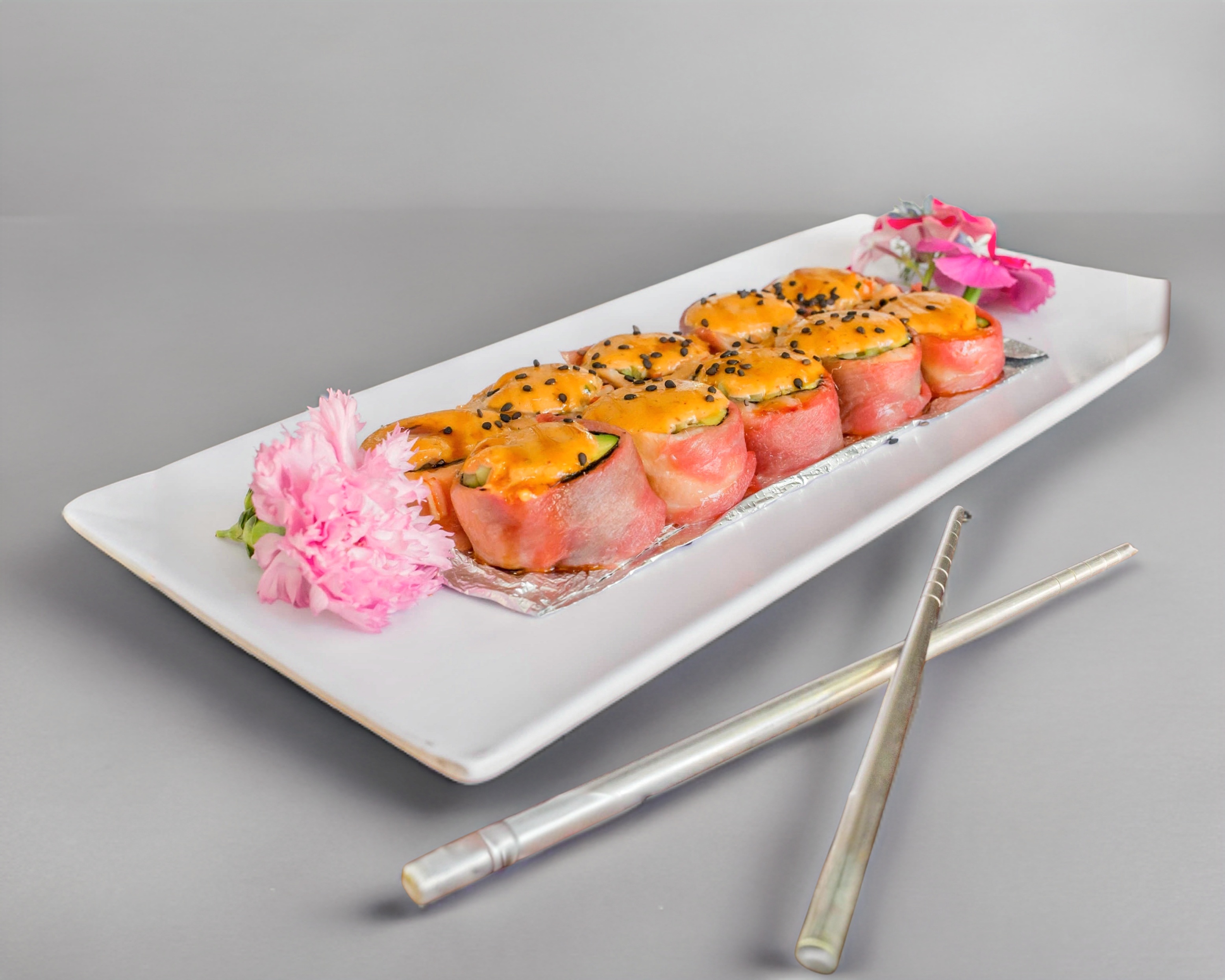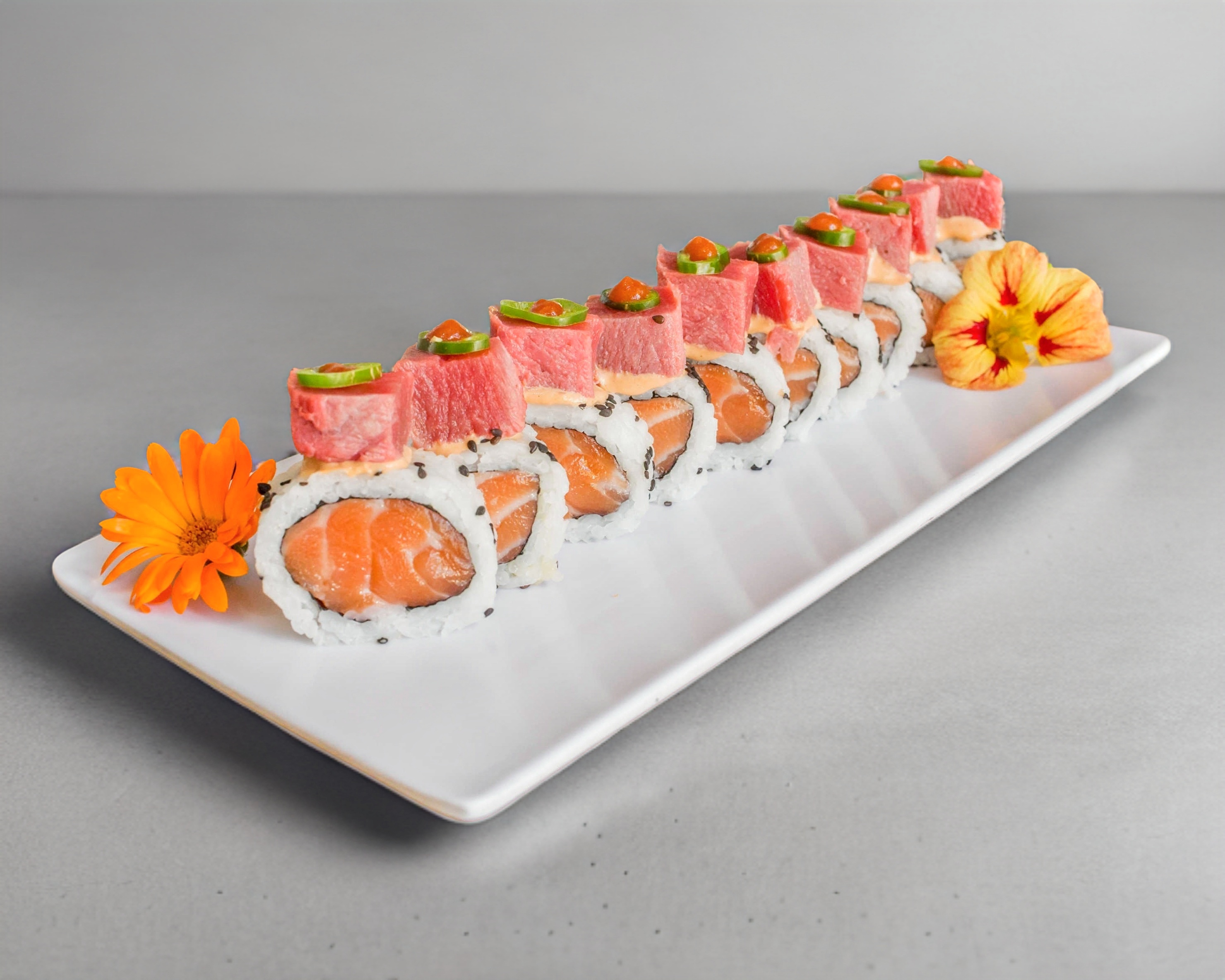 Rollo relleno de salmón, coronado con aderezo especial, atún a la plancha, sriracha y chile serrano.