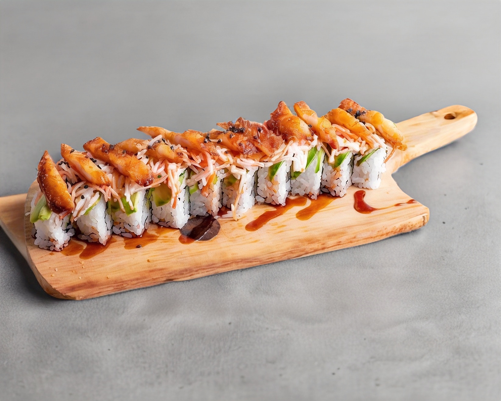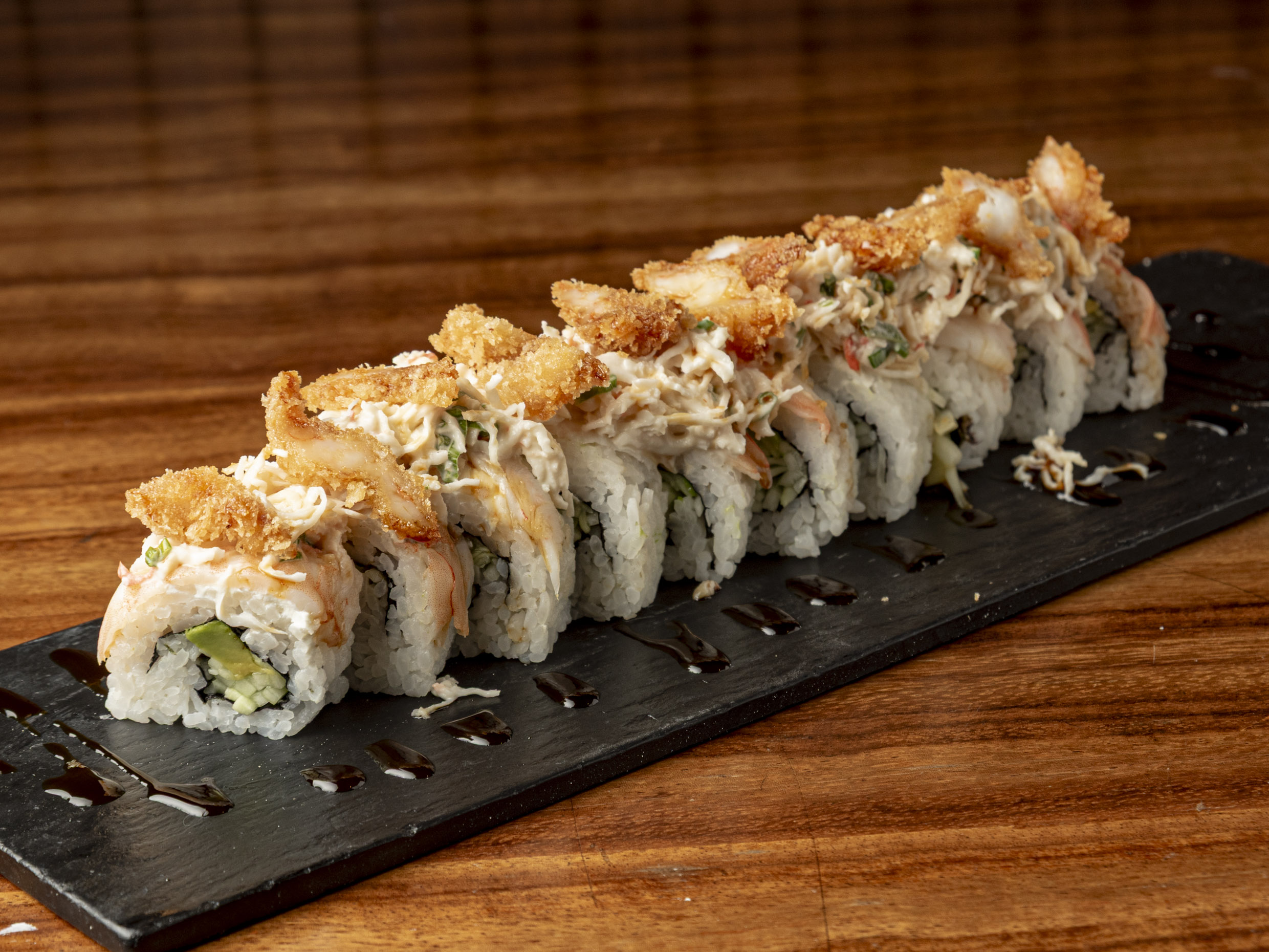 Rollo cubierto de camarón coronado con ensalada kanikama y camarón empanizado bañado con salsa de anguila y ajonjolí