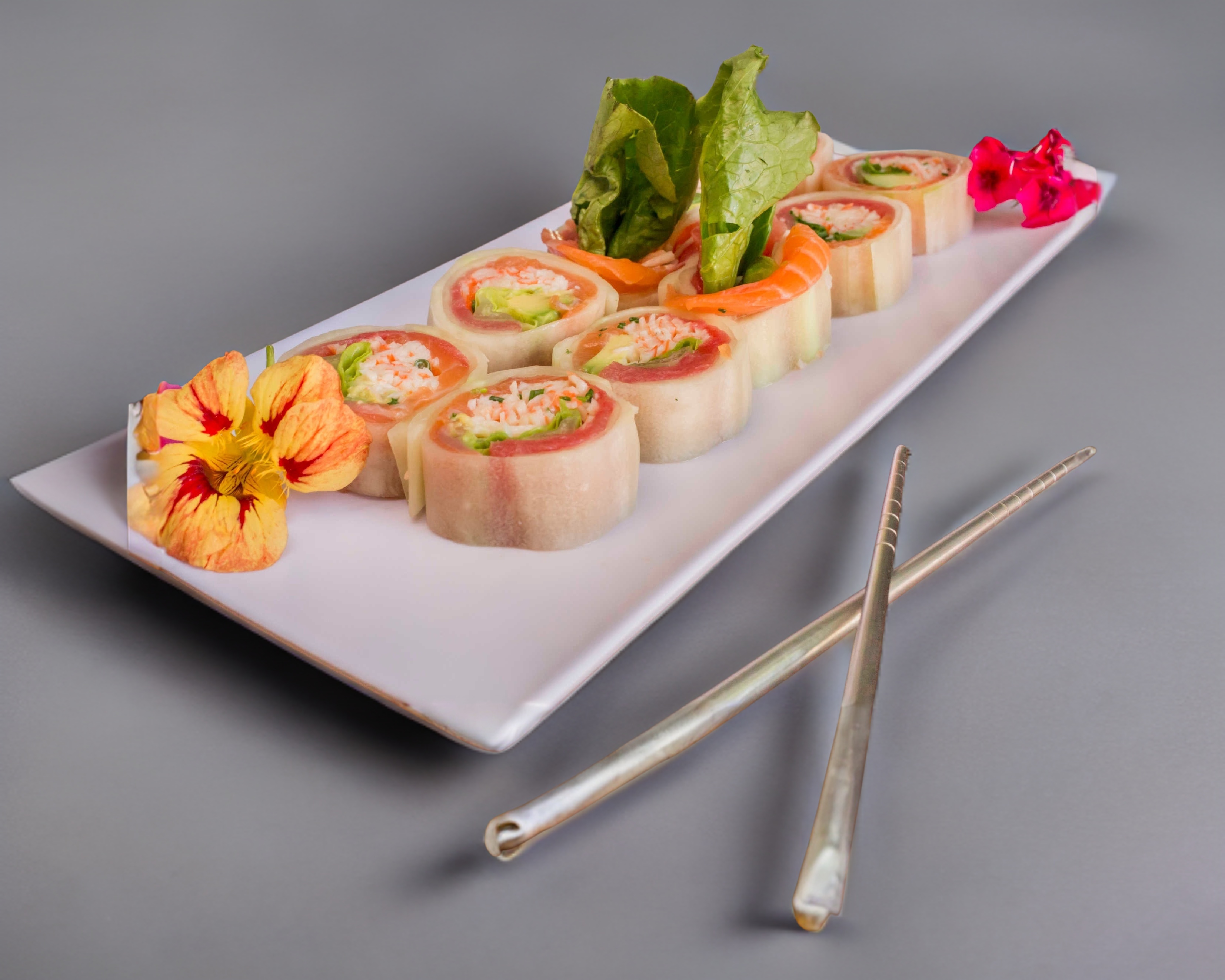 Rollo sin arroz envuelto en pepino, relleno de salmón, atún, kanikama, aguacate y lechuga.