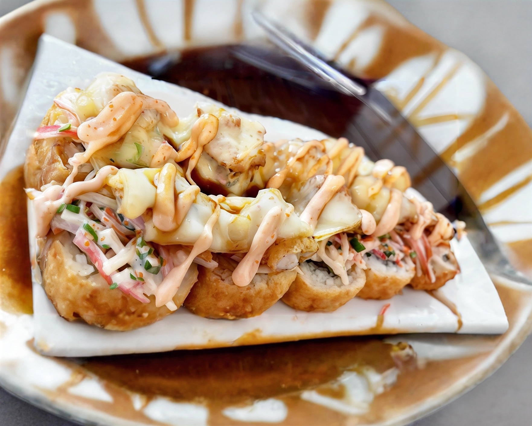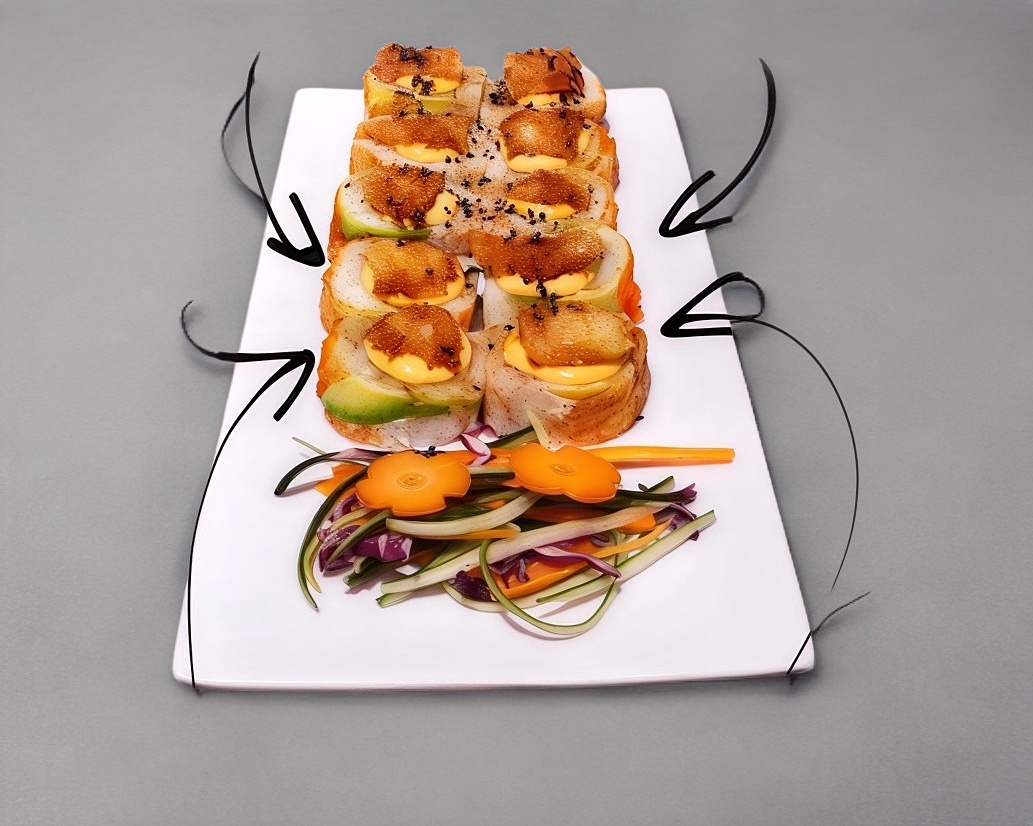 Rollo cubierto de ajonjolí, coronado con ensalada de mariscos gratinados al horno, bañado en salsa de anguila y aderezo con toques de chipotle