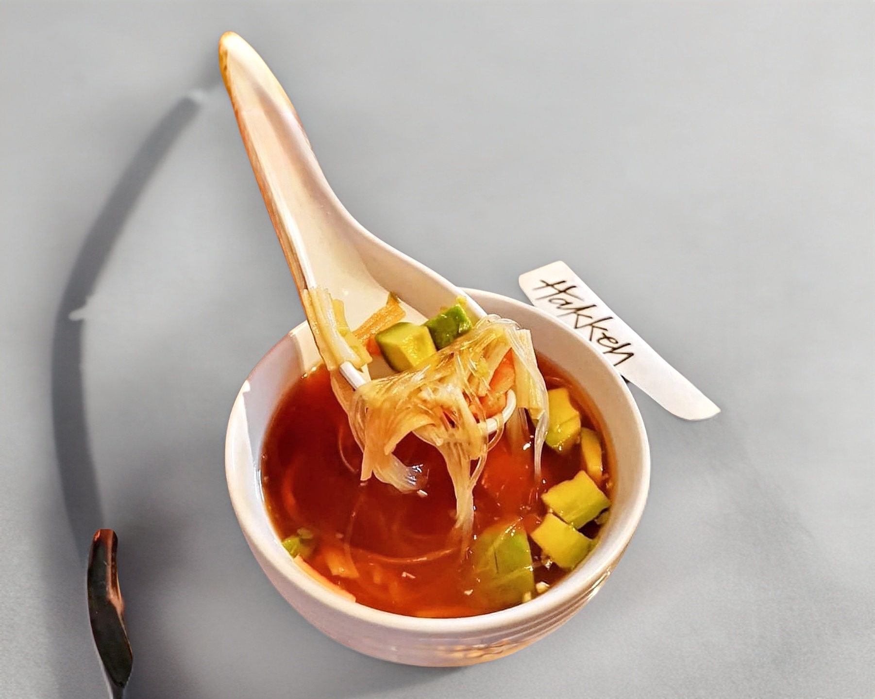 Sopa con un toque picante con harusame y combinación de mariscos.