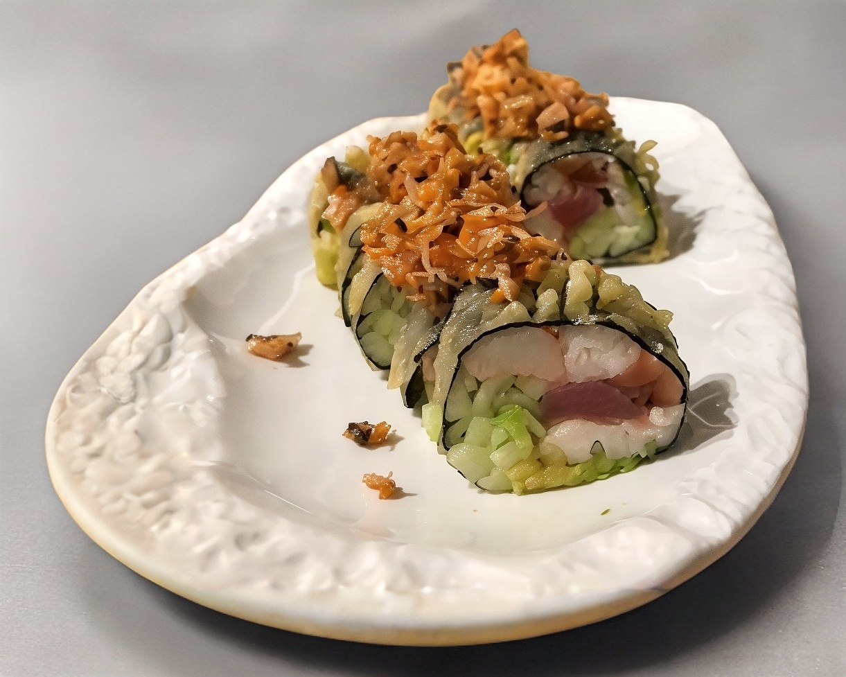 Rollo sin arroz, relleno de pepino y ensalada kani, cubierto de atún y salmón coronado con un aderezo gratinado especial