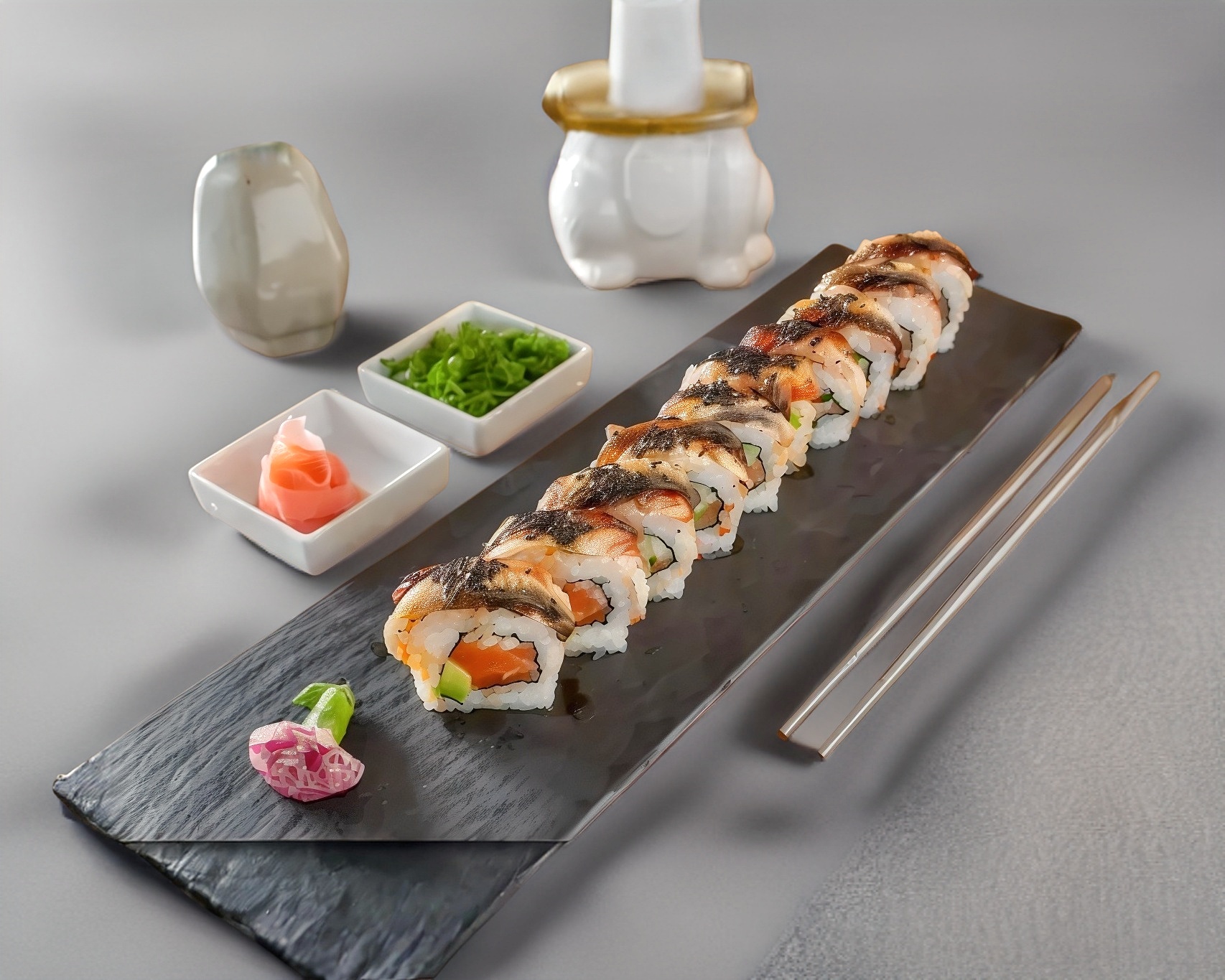 Rollo relleno de aguacate, pepino, salmón y Philadelphia con lonja de anguila flameada por fuera.