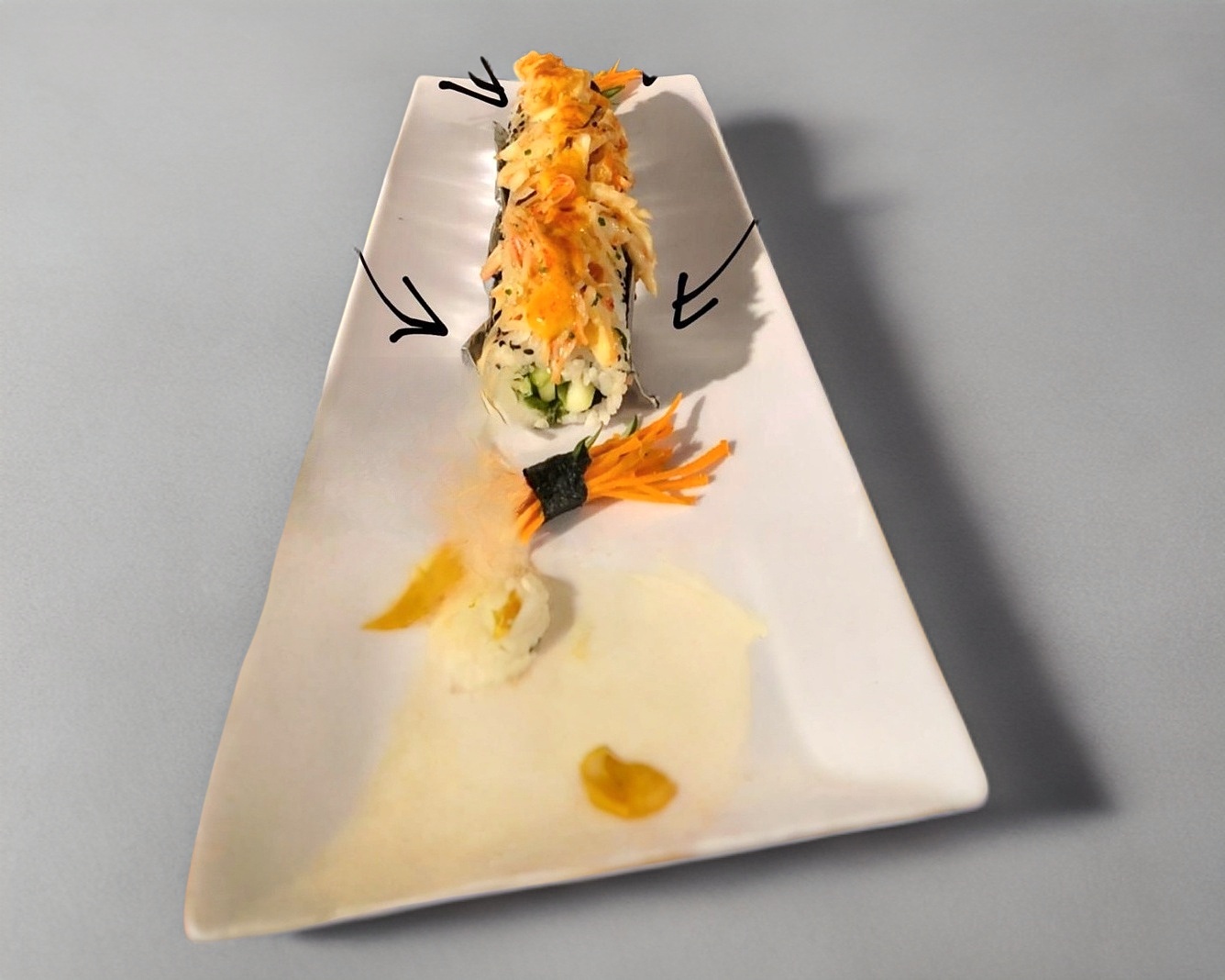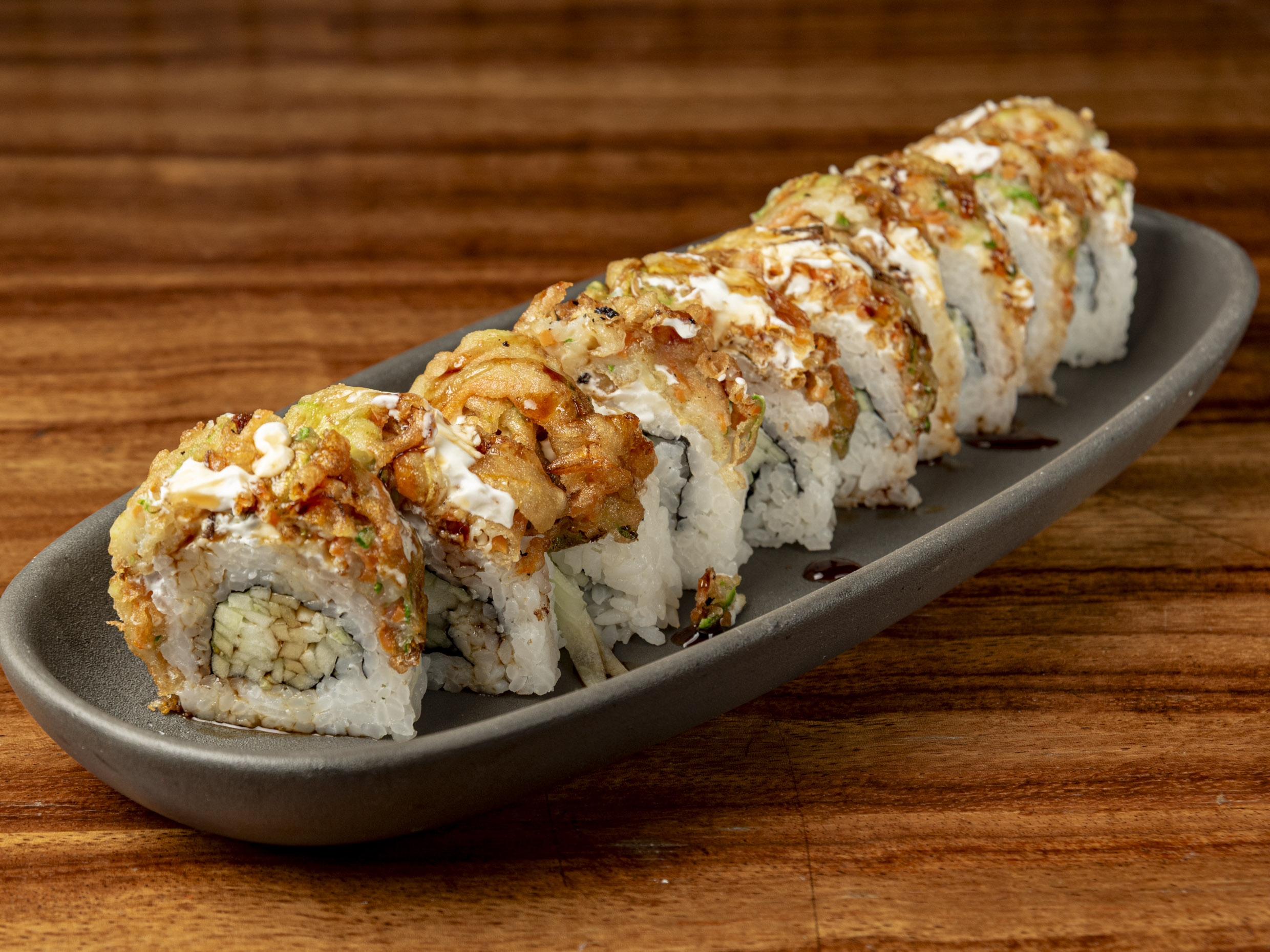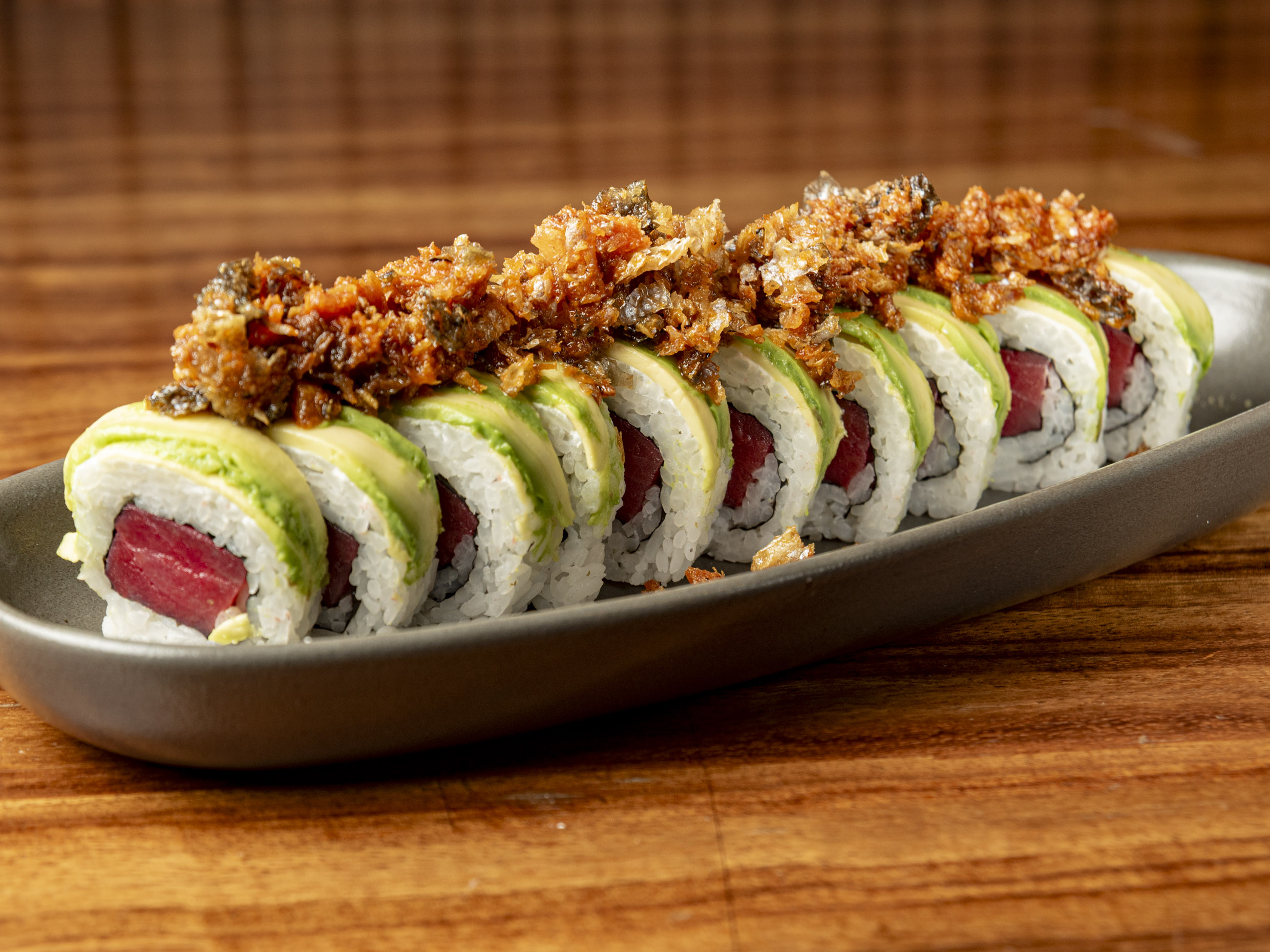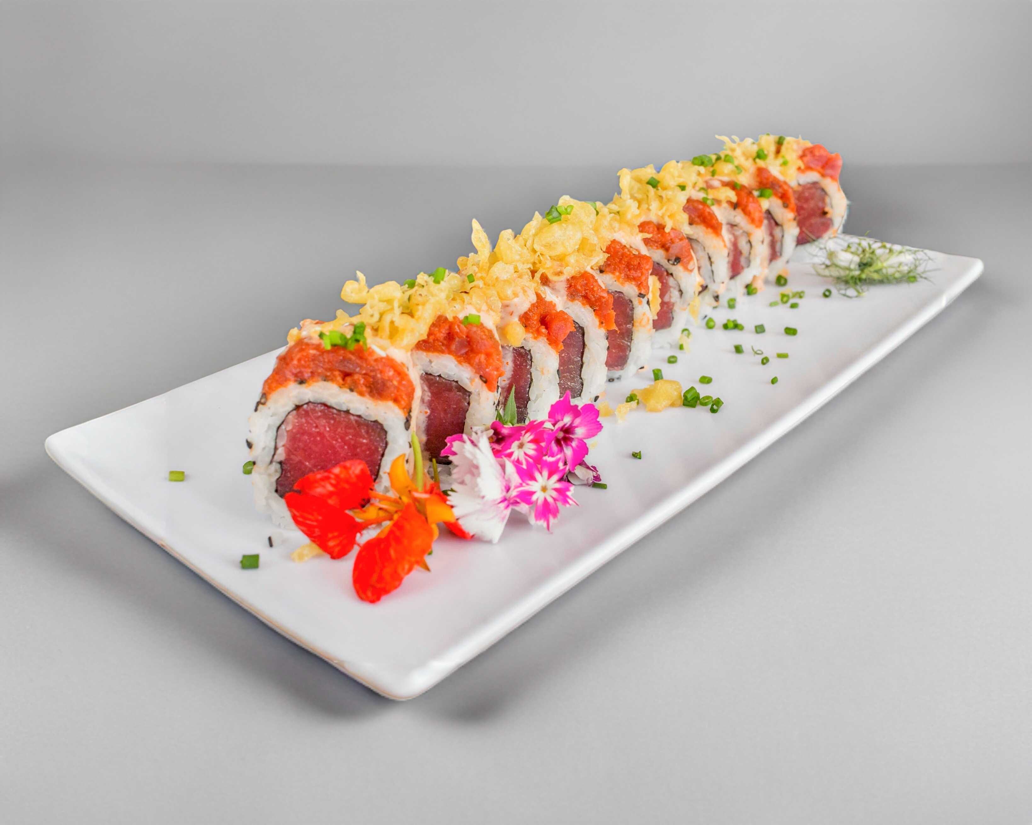 Rollo relleno de atún cubierto de ajonjolí y spicy tuna, coronado con crocante de tempura de sriracha, cebollín y aderezo.