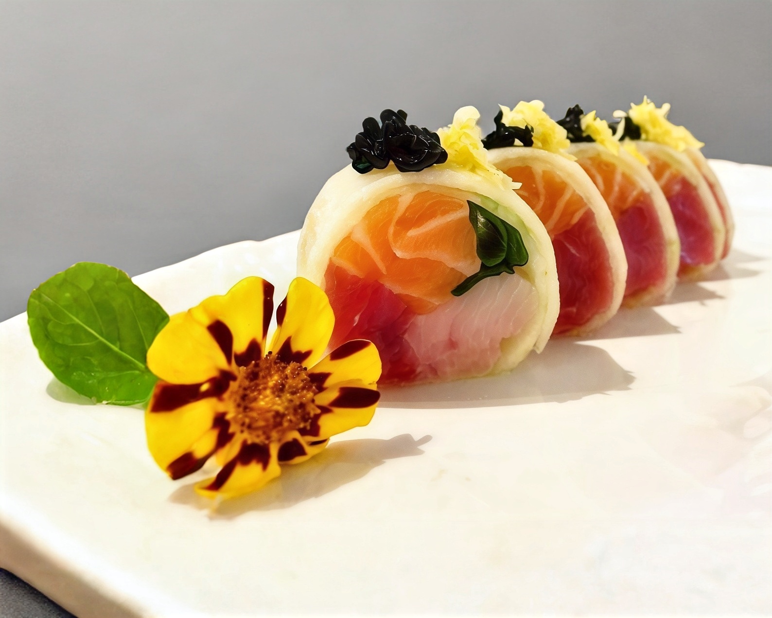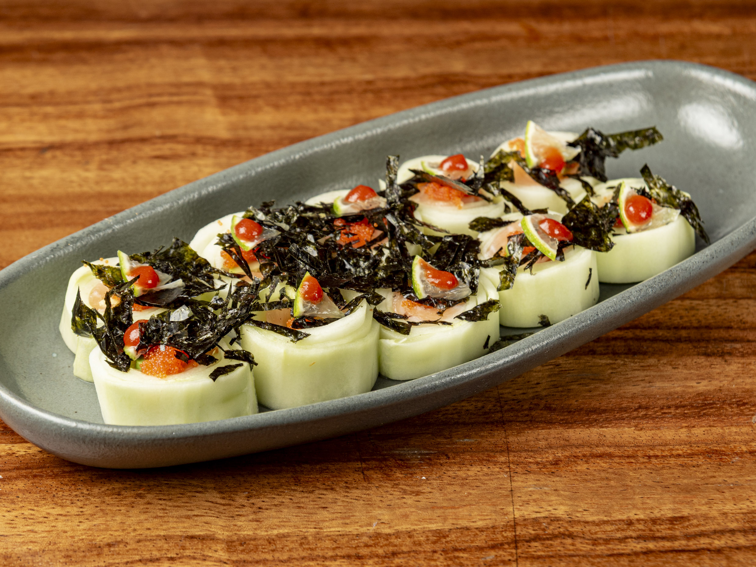 Pepino envolviendo salmón belly, atún, swordfish y cebollín coronado con caviar y ralladura de limón real.