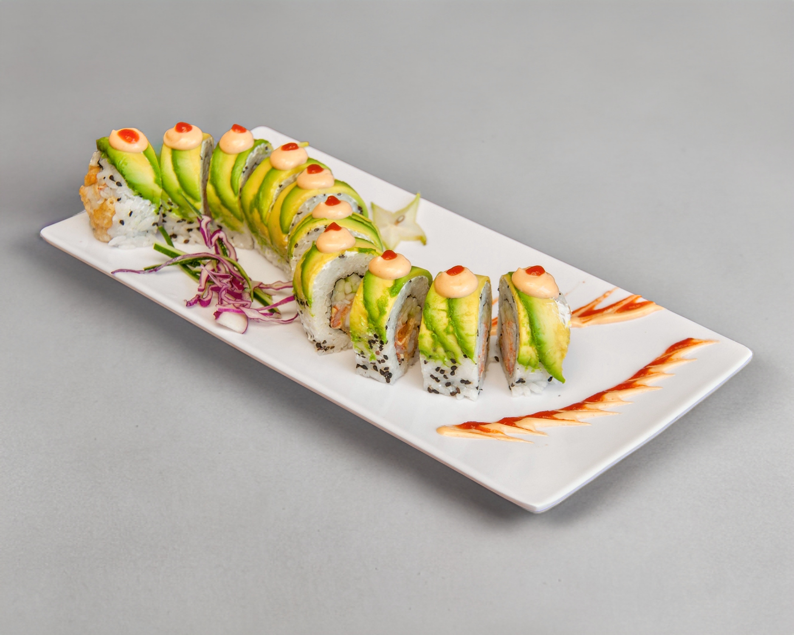 Rollo cubierto en aguacate y relleno de camarón capeado, kani empanizado, pepino, y Philadelphia coronado con aderezo de sriracha.