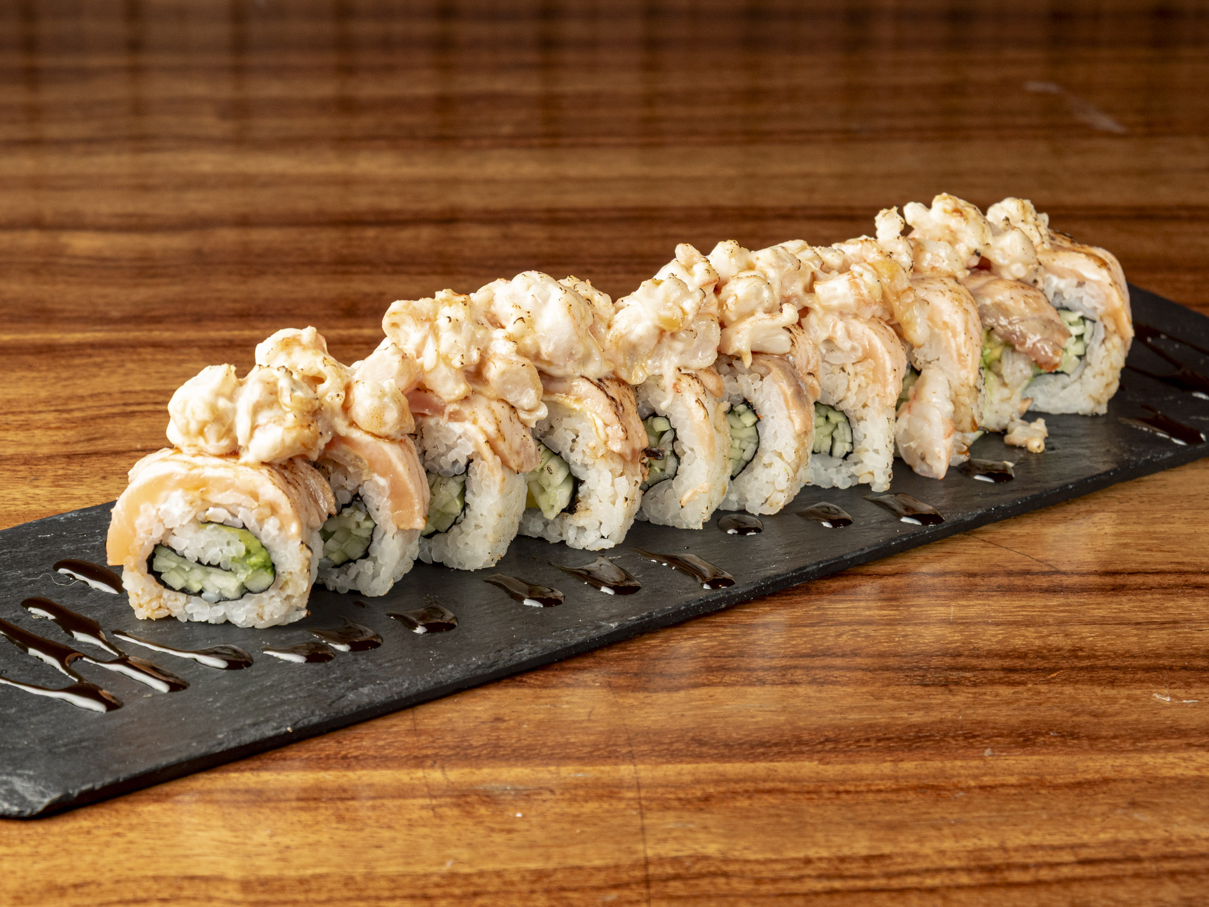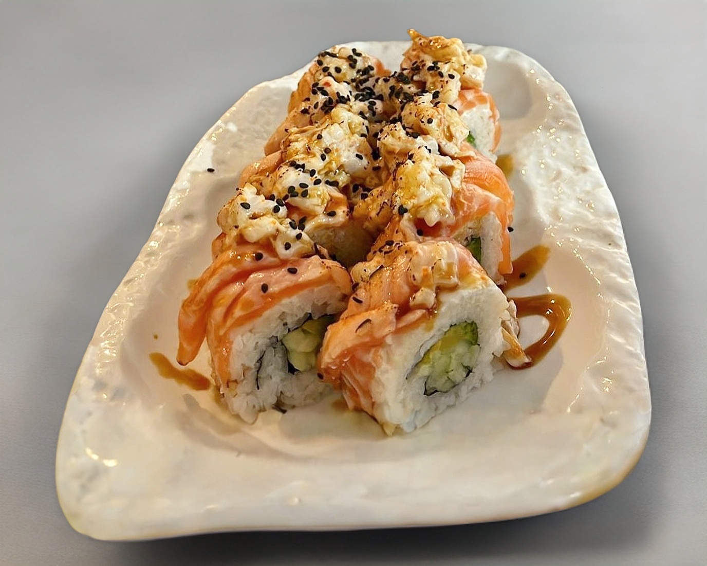 Rollo cubierto de salmón gratinado con aderezo especial de camarón, bañado en salsa de anguila y ajonjolí.