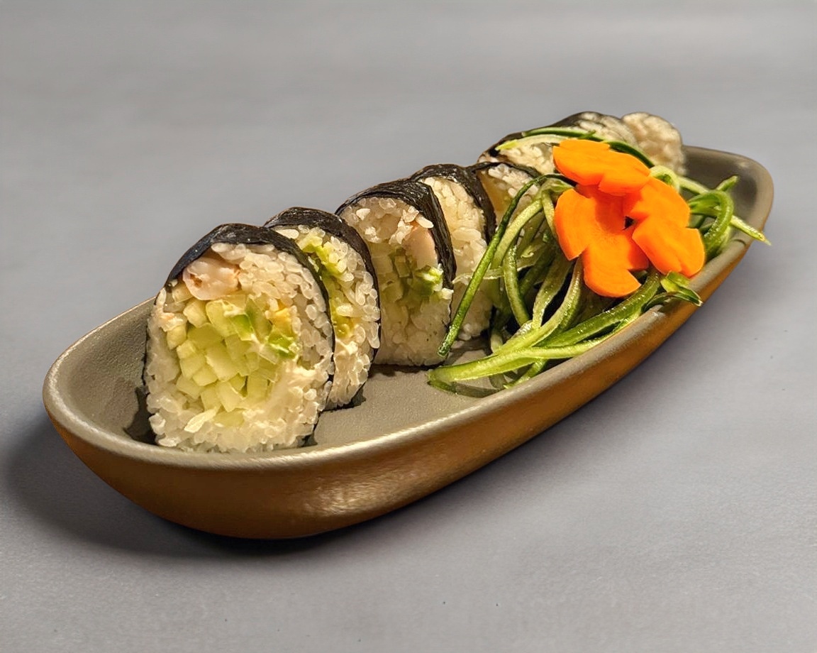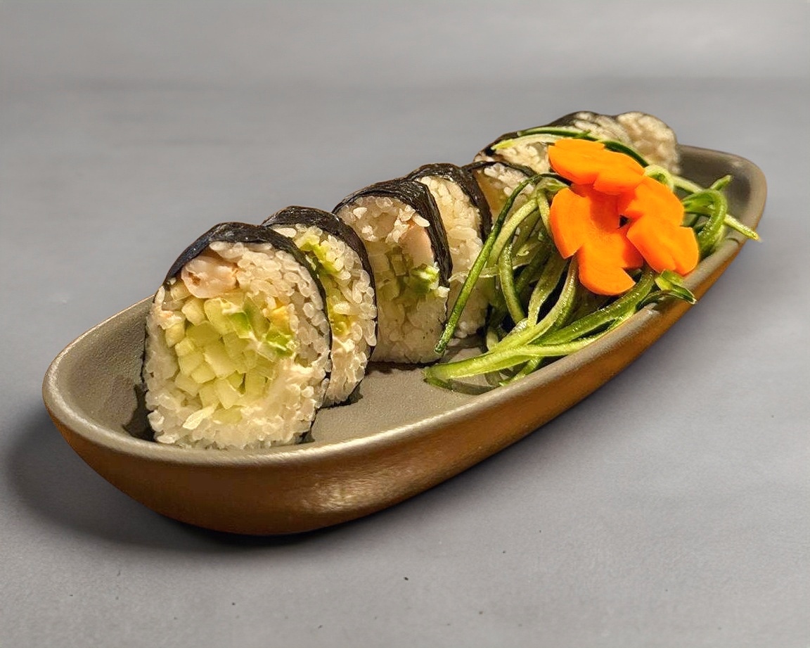 Rollo de Nori con pepino Philadelphia y proteína a elección cubierto de arroz y ajonjolí
