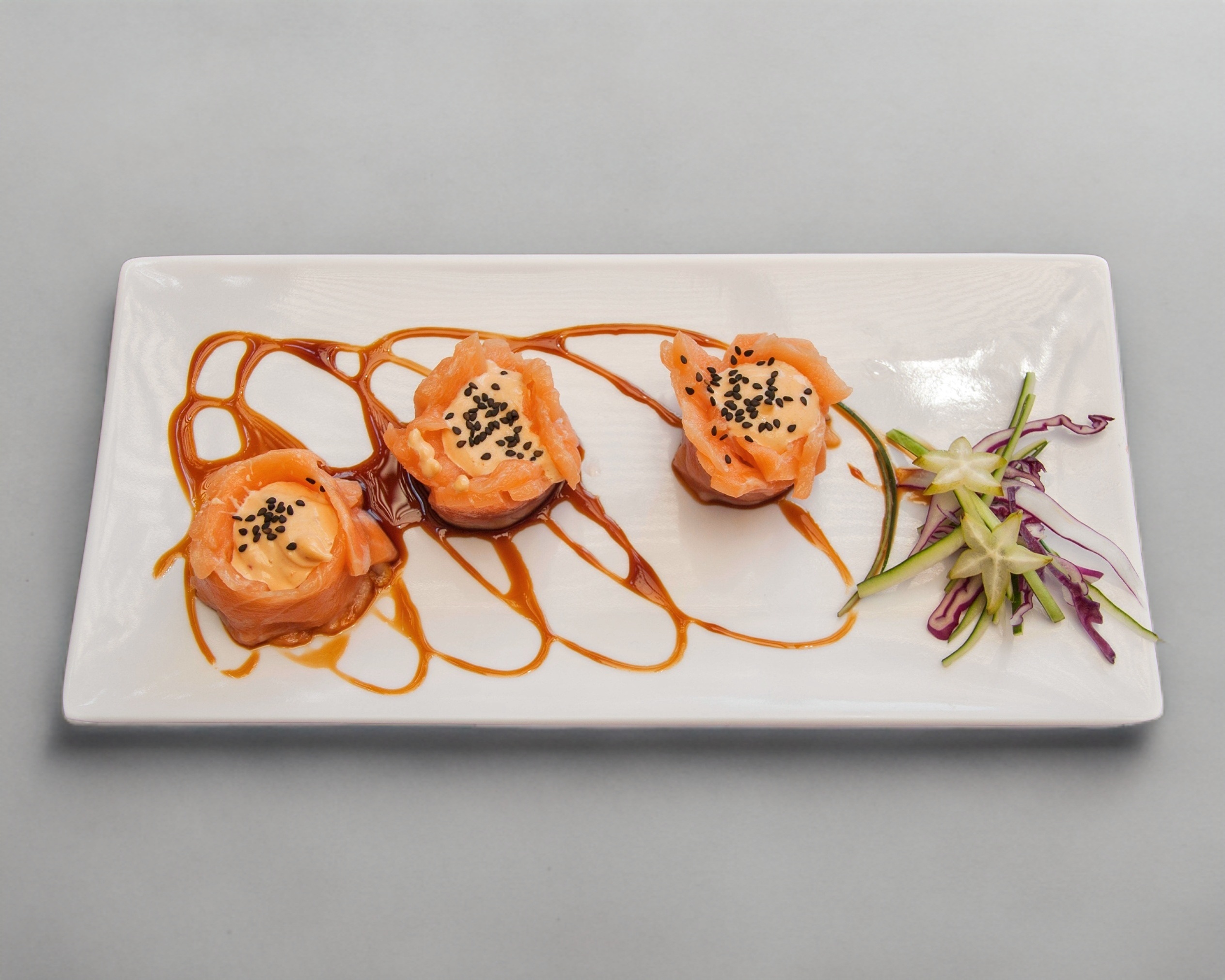 3 pz. Rosas de salmón con un toque de aderezo chipotle y salsa de anguila.