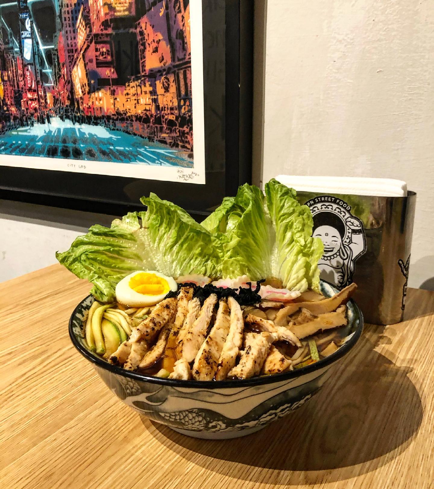 Ramen con noodles y fideos de verduras acompañado de zanahoria, hongos, espinaca, col morada y teriyaki chicken.