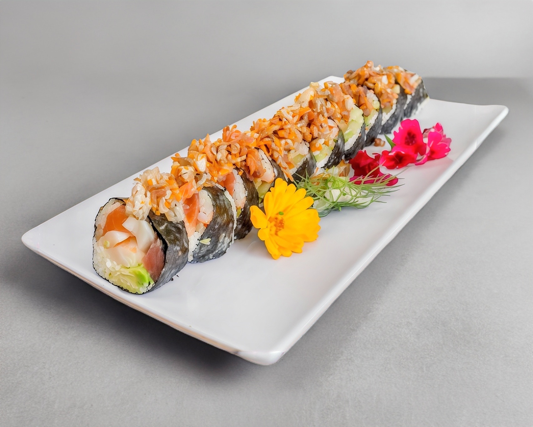 Philadelphia, kanikama y pepino por dentro, coronado con atún, fritura de salmón, camarón empanizado, anguila, cebollín y un twister de aguacate.