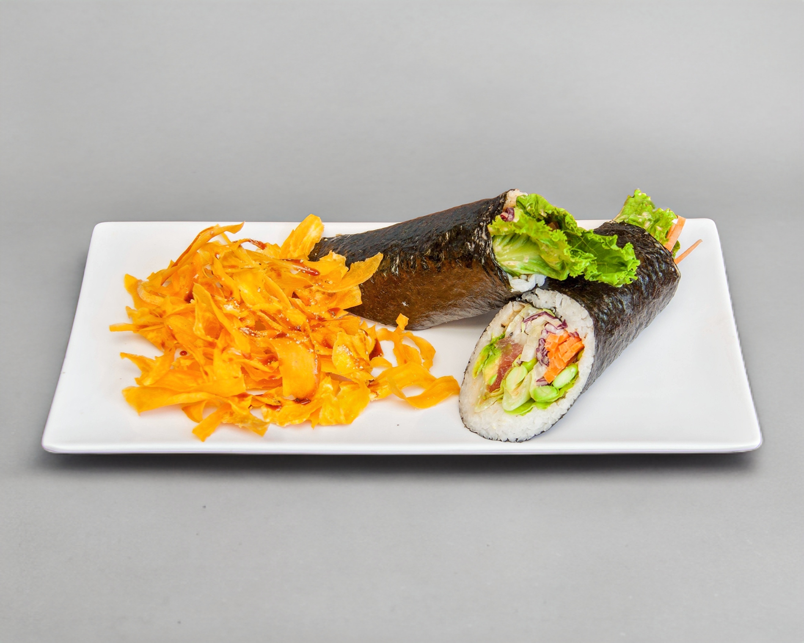 Nori por fuera, relleno de arroz gohan, pepino, lechuga, zanahoria, col morada, philadelphia, aderezo chipotle, salsa de anguila y edamames combinados con la proteína de tu elección.
