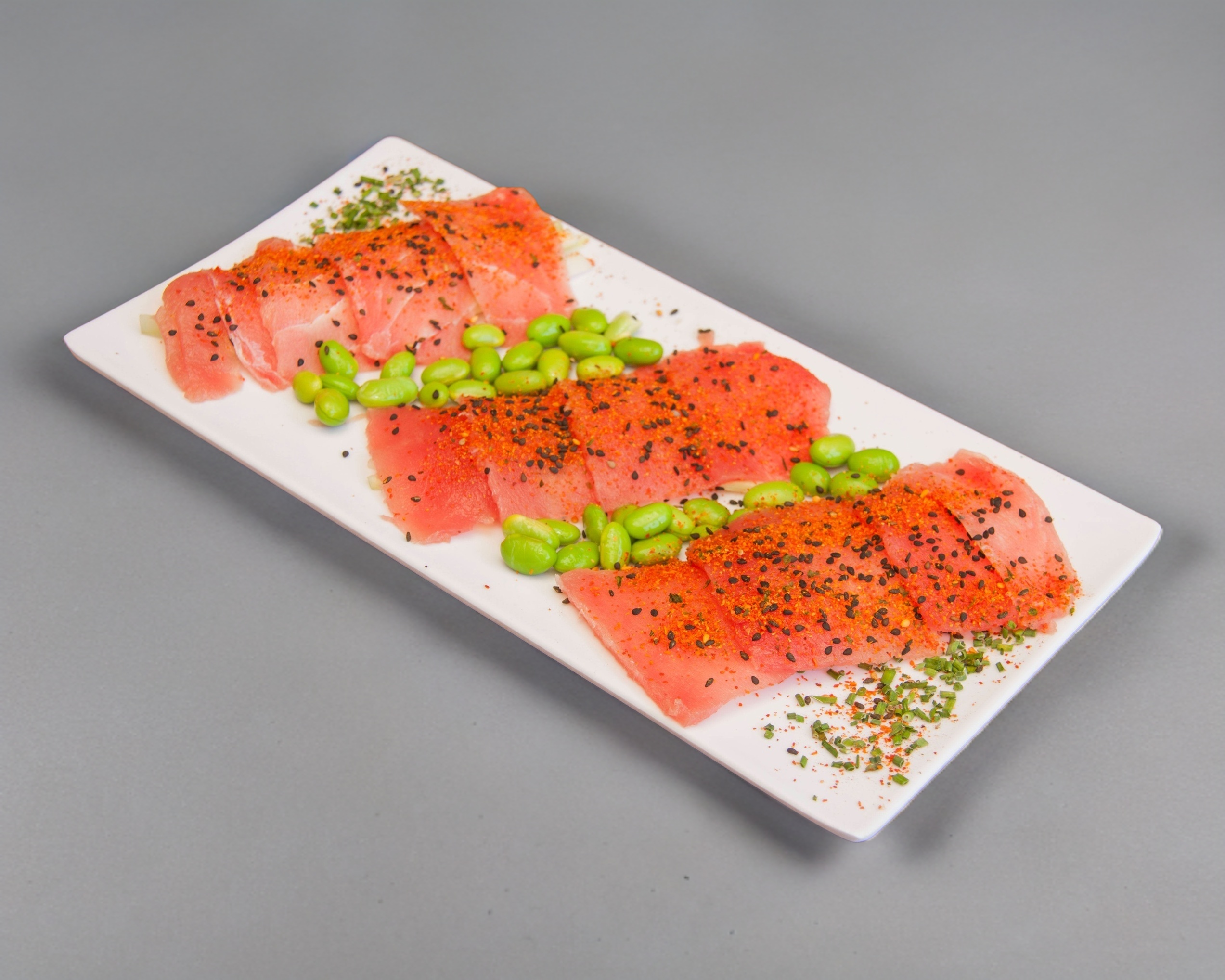 Láminas a elegir de atún o salmón sobre una cama de pepino con cebollín, ajonjolí y shichimi.