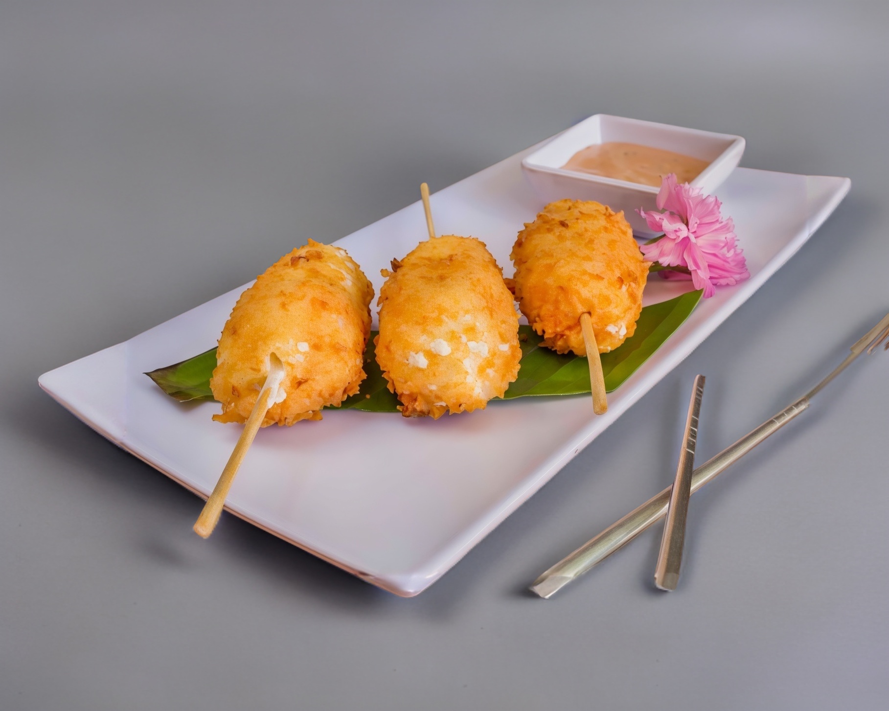 Brochetas empanizadas de camarón rellenas de Philadelphia, acompañadas de aderezo chipotle.