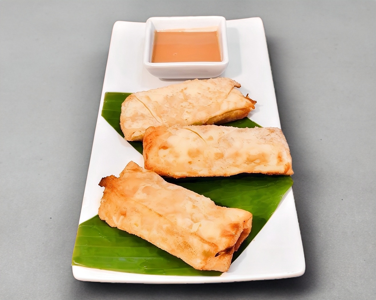 Rollitos primavera hechos con pasta de egg roll rellenos de col, zanahoria, apio, aceite de ajonjolí, acompañados de salsa de cacahuate.