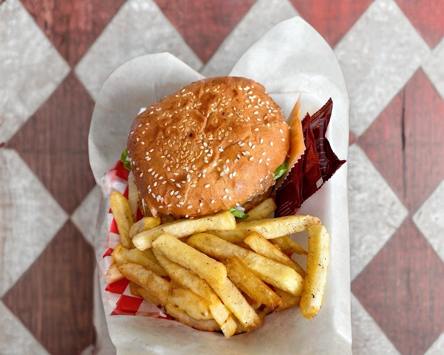 Carne de res, lechuga, jitomate, cebolla ,catsup ,mostaza papas ala francesa y 1 coca cola de 355ml