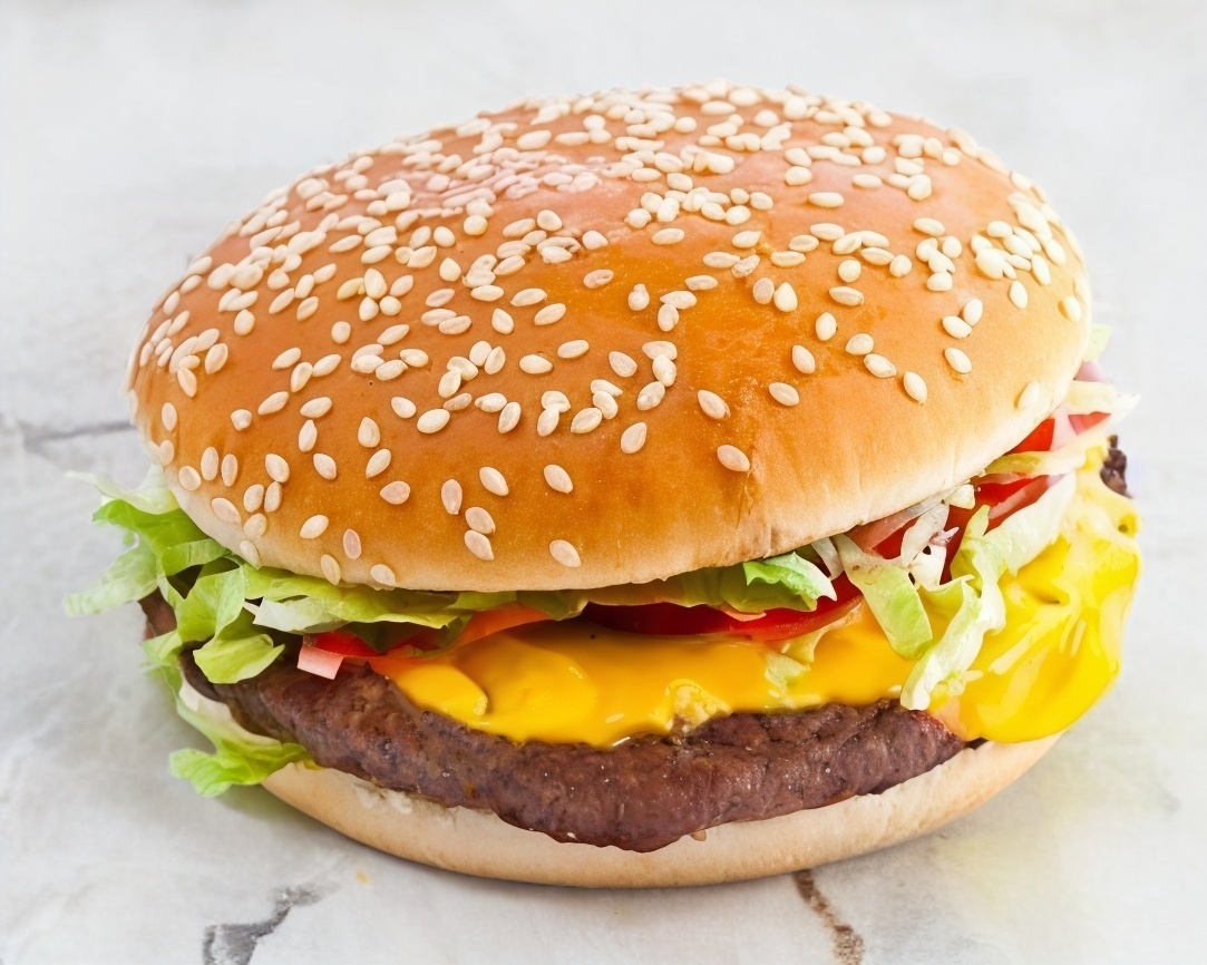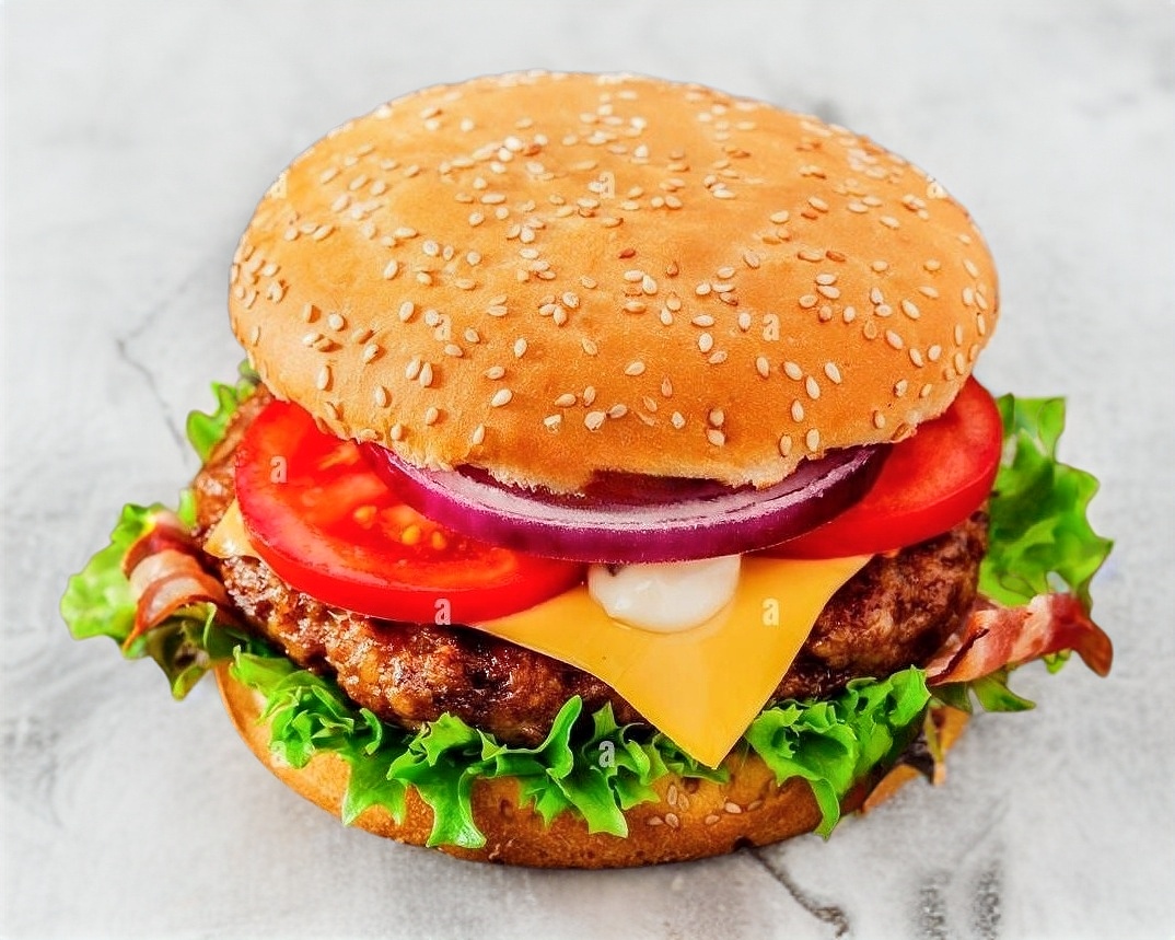Hamburguesa Grande :Crema, catsup, mostaza, cebolla, jitomate, lechuga, chile jalapeño, carne(180 gramos )