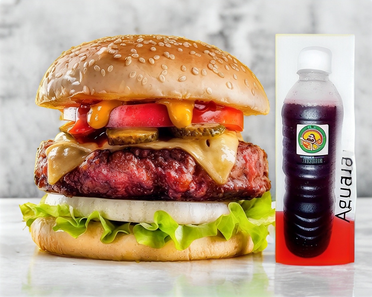 1 Agua Fresca 400 mil.( presentacion botella ) + Hamburguesa al Carbón Mediana 100gr carne de res, Jitomate, lechuga, cebolla, chile, jalapeño, cátsup, crema y mostaza, queso amarillo