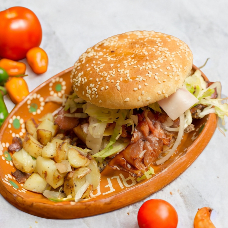240 grs. de carne preparada, verdura, doble queso Amarillo, y jamón.