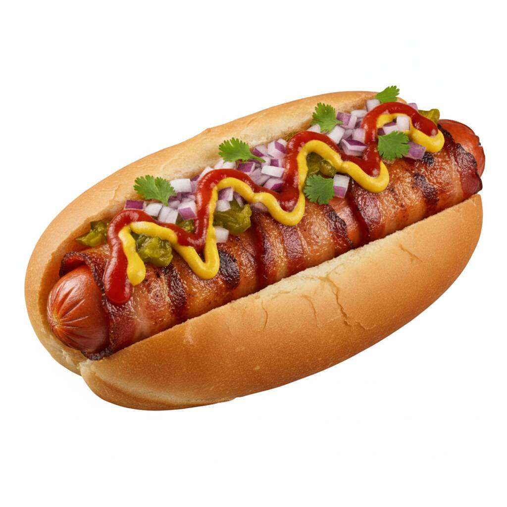Hot Dog con salchicha de pavo envuelta en tocino + cebolla caramelizada y chile toreado