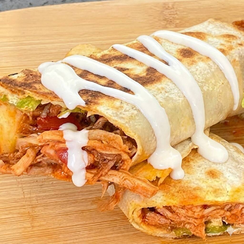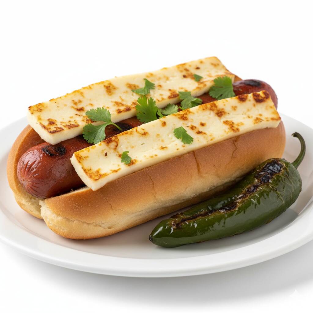 Hotdog con salchicha de pavo envuelta en tocino con panela fresca, cebolla caramelizada y chile toreado