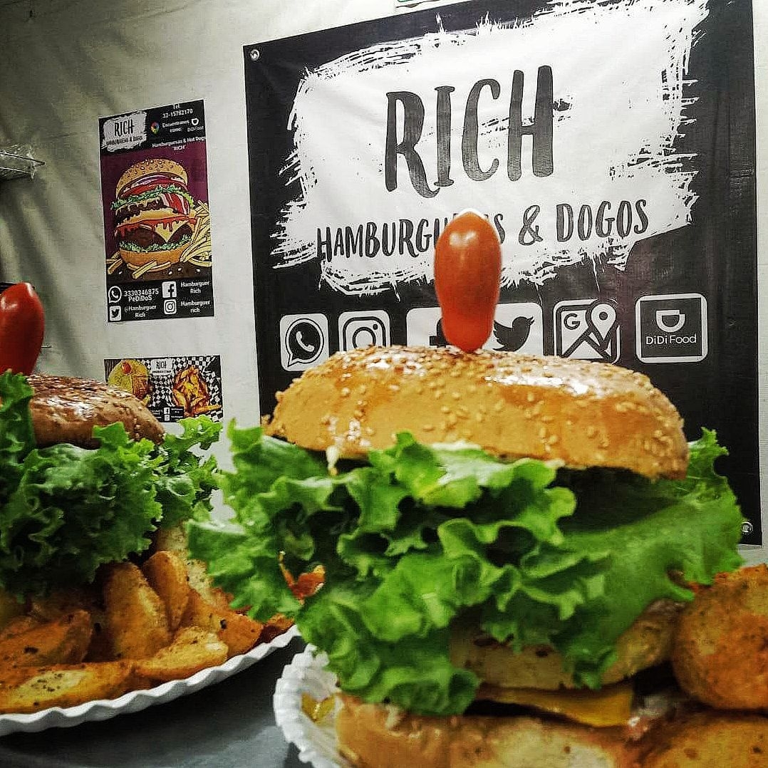Hamburguesa rich con carne de res de arrachera 150grs, jitomate, cebolla, cebolla azada, lechuga, 1 agua de 1/2 litro, 1 dogo con salchicha de pavo, tocino ahumado, jitomate, cebolla, cebolla asada y panela.