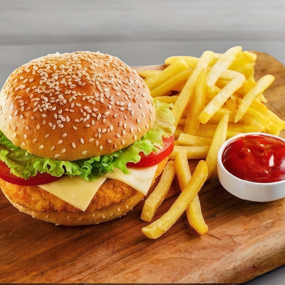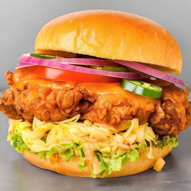 Hamburguesa de boneless (pieza de boneless (pollo frito)) pan tradicional acompañado de verduras( jitomate cebolla peino queso amarillo lechuga ) , queso manchego y aderezos básico (catsup, crema ,mostaza )