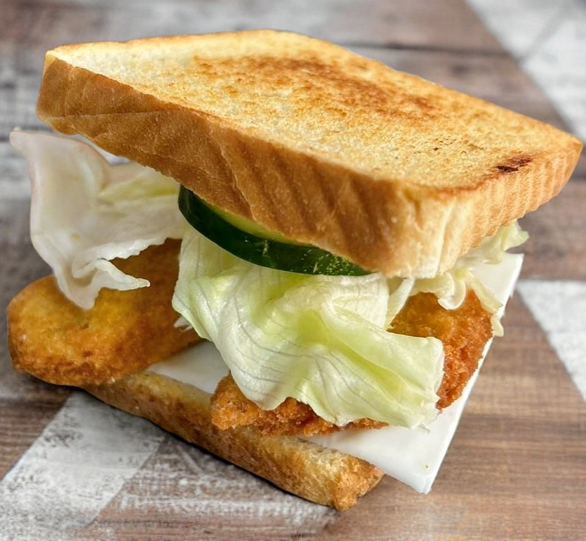 sandwich de pollo frito acompañado con tocino , queso manchego , lechuga , jitomate, cebolla , pepino , zanahoria , aderezos básicos (catsup, crema , mostaza )