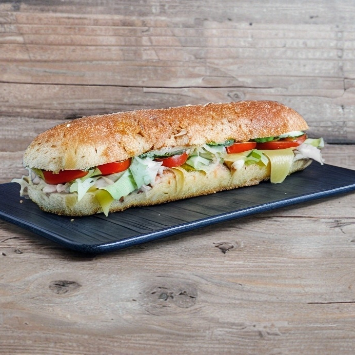baguette de pollo a la plancha con lechuga-jitomate-pepino-zanahoria-queso manchego-cebolla-aderezos