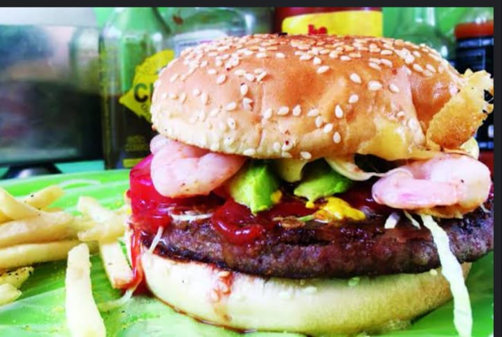 Camarones y carne de res, aderezo chipotle, mayonesa, lechuga, jitomate, cebolla, pepinillo, queso amarillo, aguacate, cátsup y mostaza.